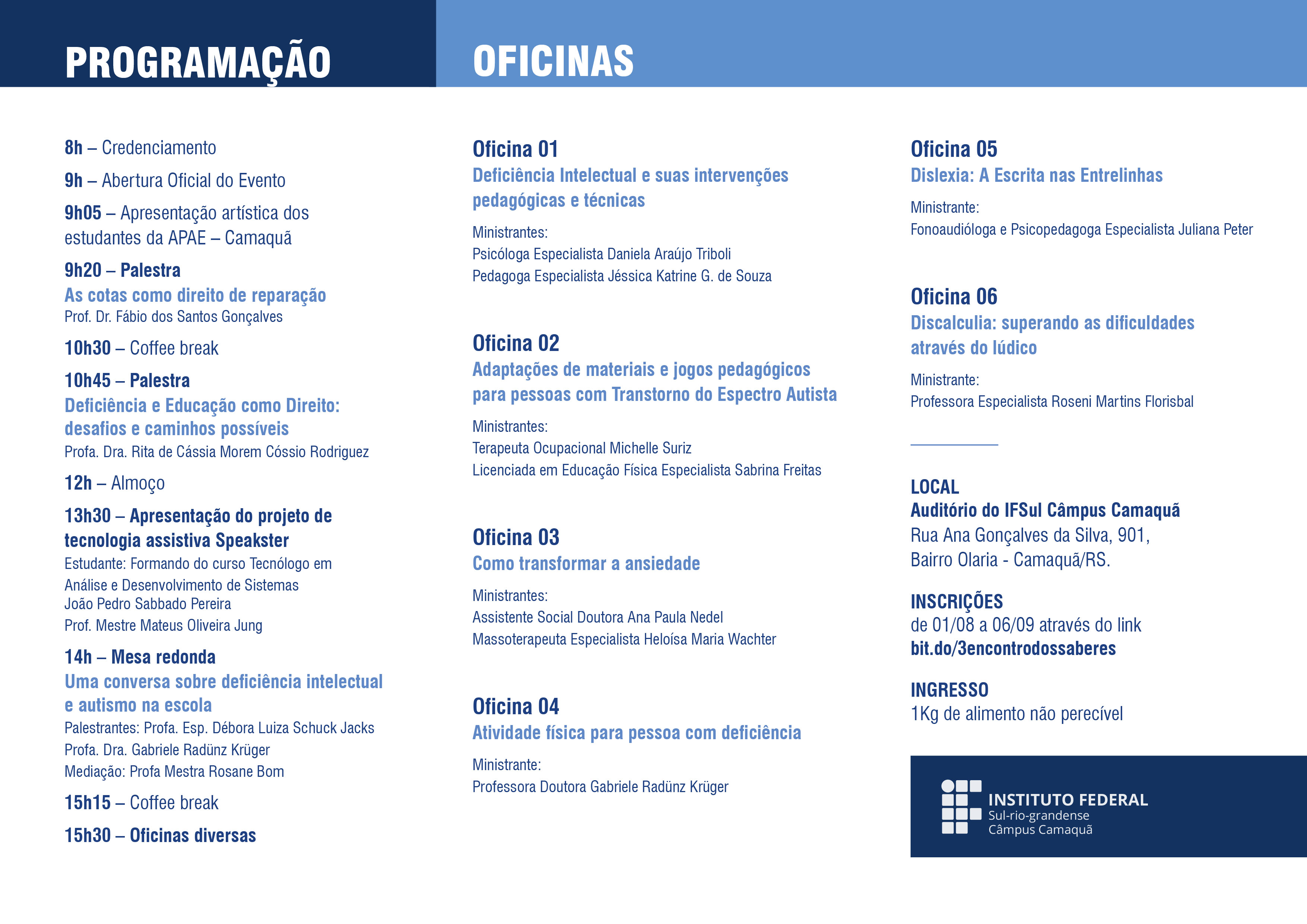 Palestras, mesa redonda e oficinas diversas fazem parte da programação da terceira edição do Encontro de Saberes Inclusivos, organizado pelo câmpus Camaquã do IFSul. O evento ocorre no dia 11 de setembro, das 8h às 18h e as inscrições podem ser feitas no site até o dia 6 de setembro.