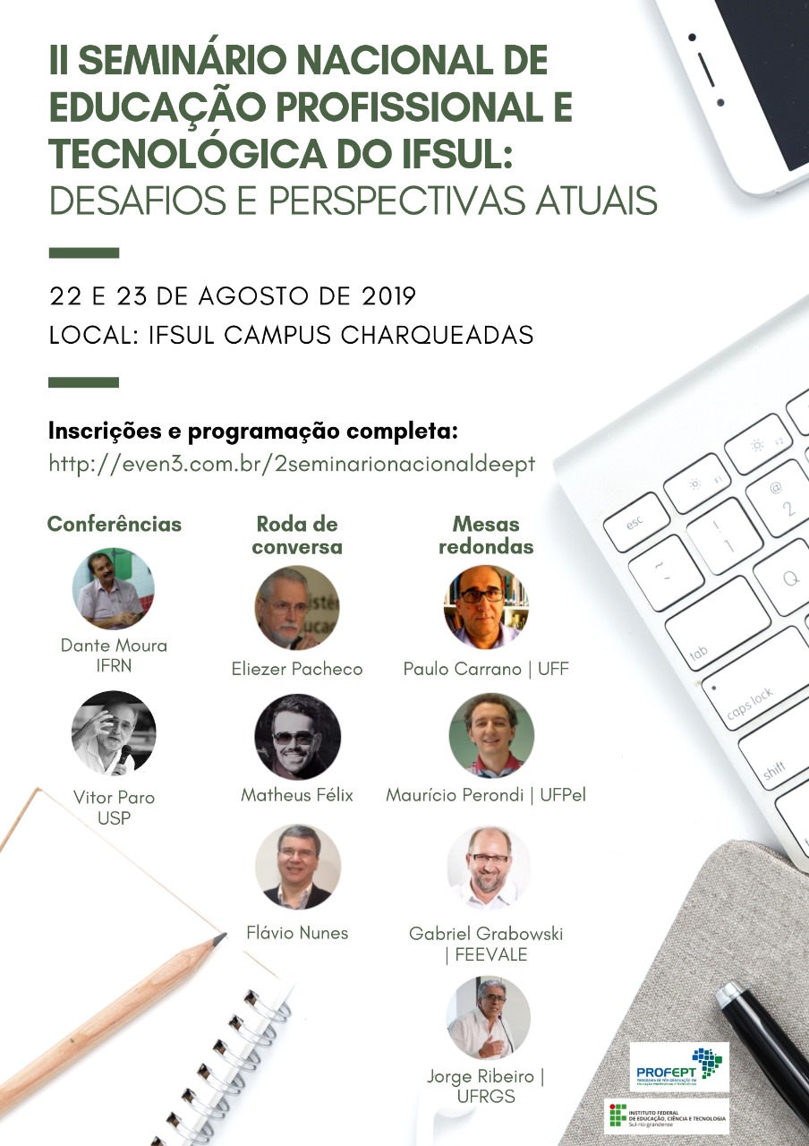 O Programa de Pós-Graduação em Educação Profissional e Tecnológica em Rede do IFSUL (ProfEPT/IFSul) realiza, nos dias 22 e 23 de agosto, o 2º Seminário Nacional de Educação Profissional e Tecnológica do IFSul: desafios e perspectivas atuais. As inscrições são gratuitas e podem ser feitas aqui, até quinta-feira (22).