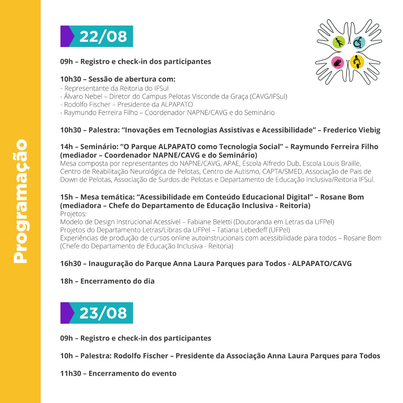 A união de temas como tecnologia e inovação com questões relacionadas à inclusão e à acessibilidade é uma das marcas do 4º Seminário Nacional de Ciência, Tecnologia e Inovação: ampliando os espaços de inclusão, acessibilidade e desenvolvimento social. O evento tem programação até amanhã e será transmitido pela internet. Na tarde dessa quinta-feira acontece também a inauguração do parque acessível Anna Laura Parques Para Todos (Alpapato).