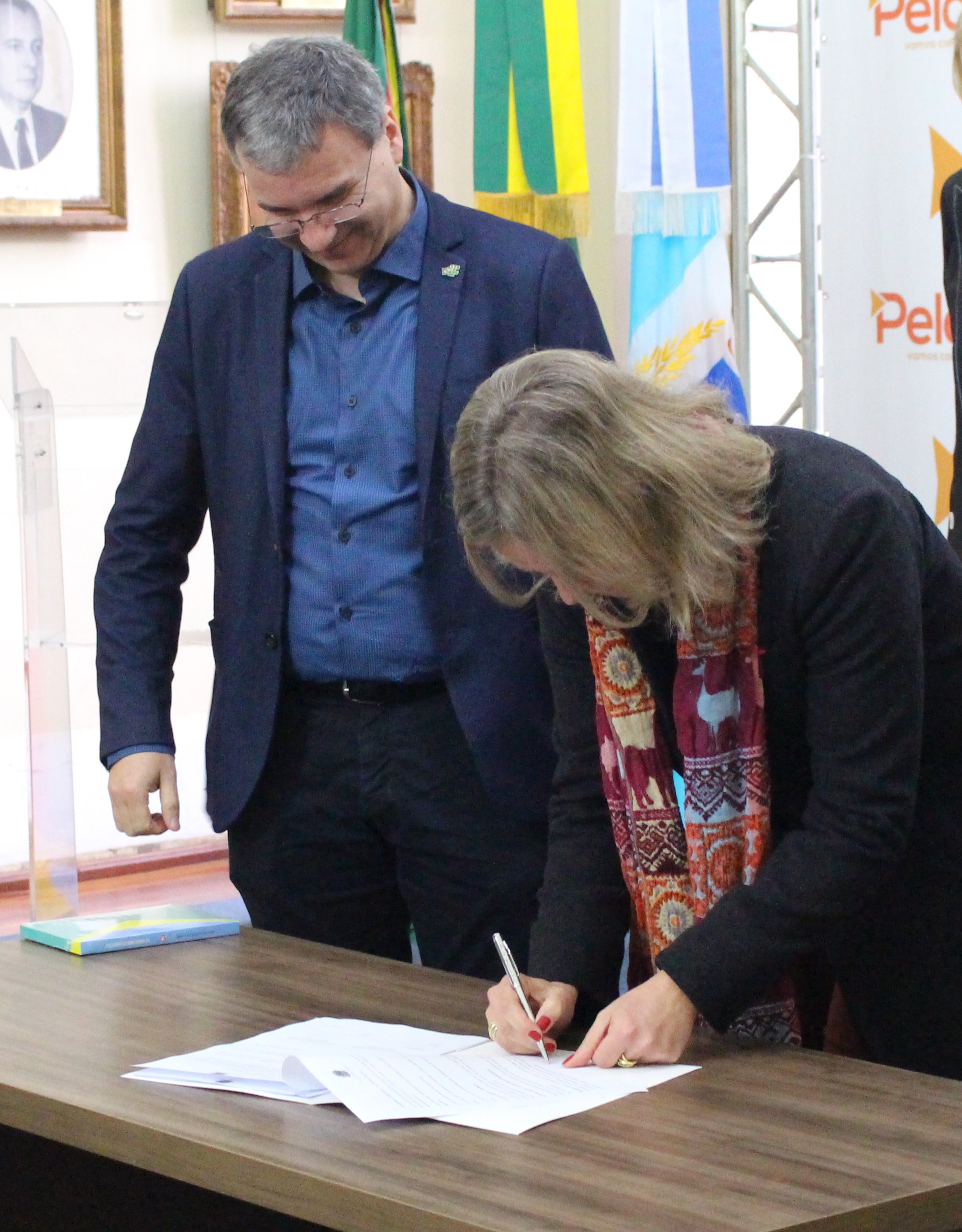 O reitor Flávio Nunes e a prefeita de Pelotas, Paula Mascarenhas, assinaram, nesta segunda-feira (16), o termo de convênio para oferta do curso de formação inicial “Cuidando do Cuidador, com início previsto para o dia 26 de setembro. A primeira turma será formada por 30 servidores da prefeitura que já exercem as funções de