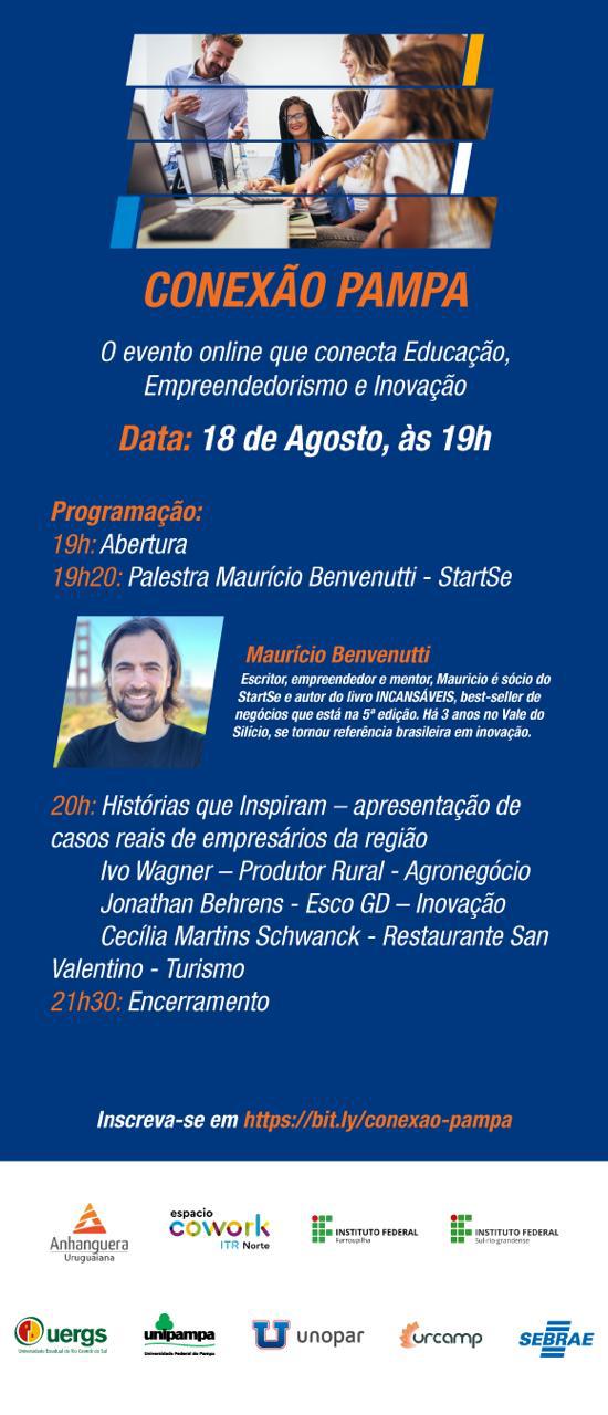 O IFSul é uma das instituições parceiras do evento do Sebrae denominado Conexão Pampa Gaúcho. O objetivo é conectar as demandas de inovação, visando unir, aproximar e mediar as instituições participantes para que tenham um mesmo olhar no desenvolvimento da região. O evento é online e acontece nesta terça (18), às 19h. A atividade é gratuita aberta e a todos os interessados.