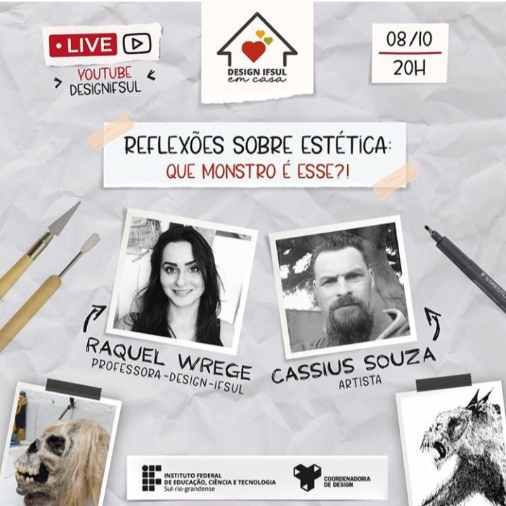 A coordenadoria de design do câmpus Pelotas transmite nesta quinta-feira (8), às 20h, em seu canal no YouTube, mais uma live do projeto Design IFSul em Casa. “Reflexões sobre estética: que monstro é esse?!” será o tema do debate desta semana, que terá como convidado o artista Cassius Souza, mestre em artes visuais e doutorando em educação pela Universidade Federal de Pelotas. Atualmente, trabalha com ilustrações e editoração de livros infantis, design de personagens, histórias em quadrinhos, modelagens digitais em 3D e efeitos especiais.