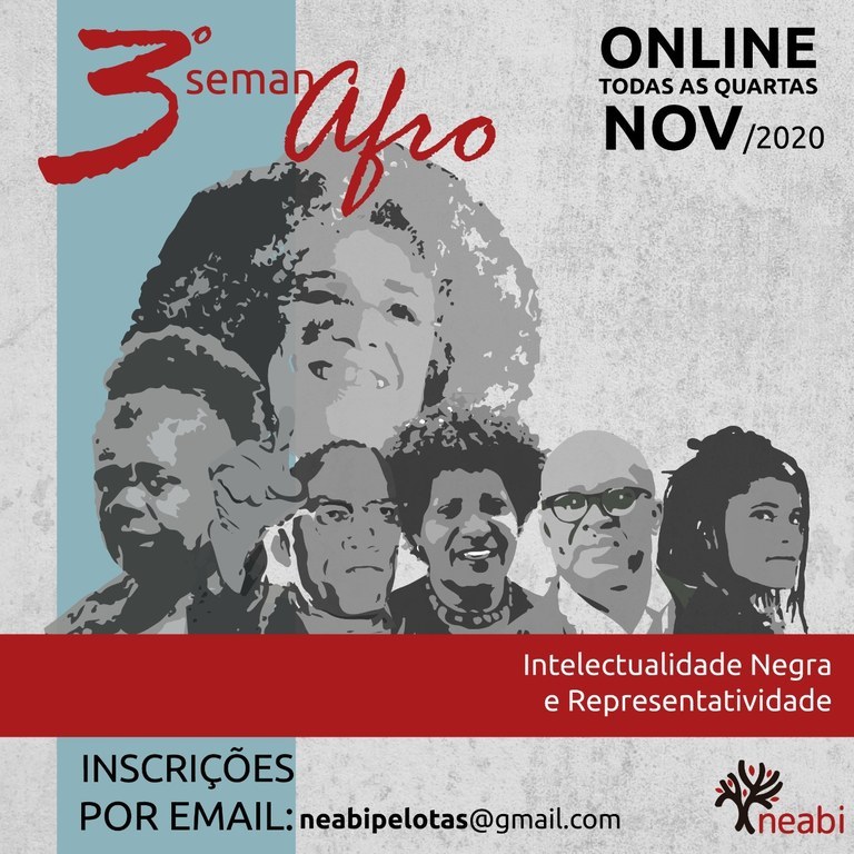 As inscrições para o evento estão abertas até 25 de novembro, pelo e-mail neabipelotas@gmail.com, e os inscritos receberão os links das atividades pelo e-mail cadastrado, sendo possível se inscrever por palestra. Promovida pelo Núcleo de Estudos e Pesquisas Afrobrasileiros e Indígenas (Neabi), a 3ª Semana Afro tem como tema “Intelectualidade negra e representatividade”. A edição deste ano será realizada totalmente online e contará com mais três palestras, nos dias 11, 18 e 25 de novembro.