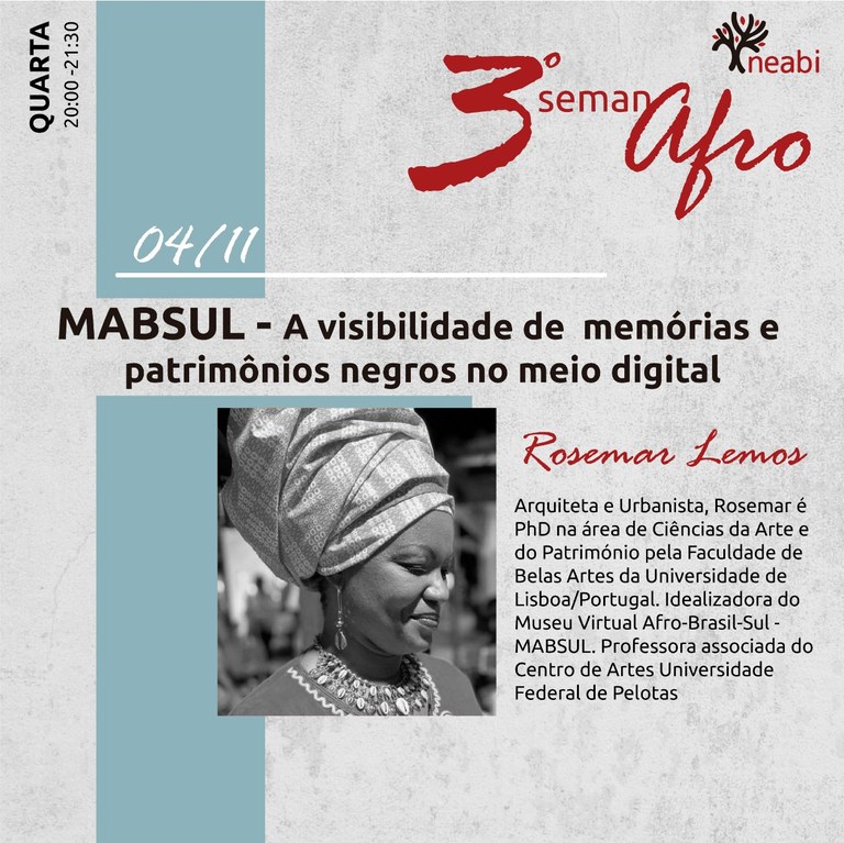 Idealizadora do Museu Virtual Afro-Brasil-Sul (MABSul), Rosemar é arquiteta e urbanista e PhD na área de ciências da arte e do patrimônio pela faculdade de belas artes da Universidade de Lisboa/Portugal. Durante a conversa, a palestrante vai discutir sobre a história e cultura negra, seus registros e compartilhamentos.