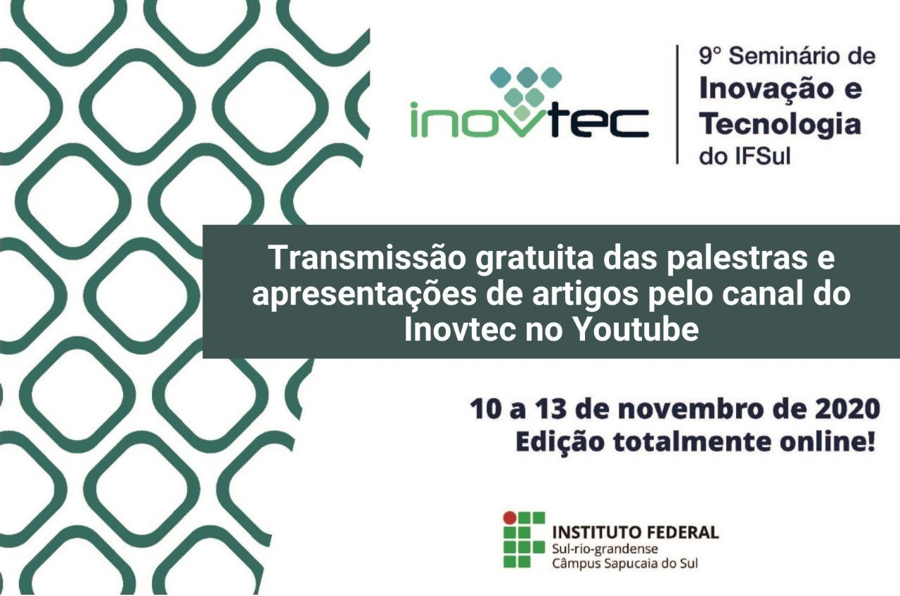 Começa, às 14h desta terça-feira (10), a programação do 9º Seminário de Inovação e Tecnologia do IFSul, o Inovtec, promovido pelo câmpus Sapucaia do Sul. Neste ano o evento será realizado pela primeira vez de forma online, com transmissão ao vivo das palestras pelo canal do Inovtec no Youtube, onde serão disponibilizados também vídeos das apresentações dos artigos inscritos.