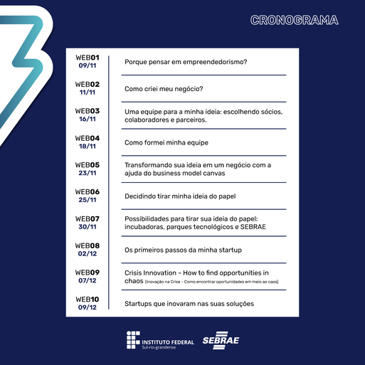Até o dia 9 de dezembro, data de encerramento do evento, serão realizados dez webinários, que ocorrerão sempre à noite, das 20h45min às 22h30min. O objetivo da proposta, segundo os organizadores, é levar a educação empreendedora a um maior número de pessoas, estimulando os participantes a desenvolverem soluções criativas e inovadoras relacionadas à produção de ideias, planos, ações, produtos, serviços, entre outros.