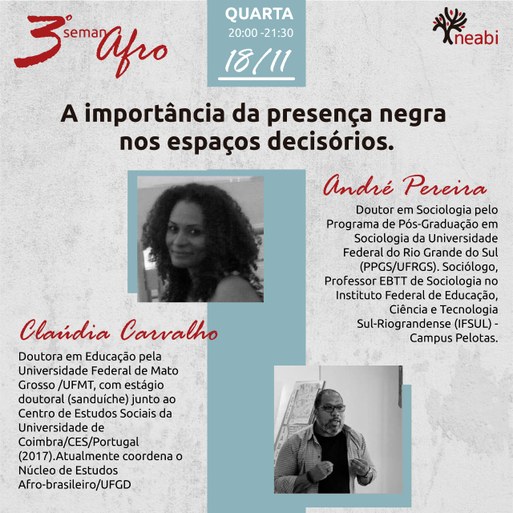 Nesta quarta-feira (18), ocorre a terceira atividade da Semana Afro do câmpus Pelotas. Os convidados dessa edição são Cláudia Carvalho, professora e coordenadora do Núcleo de Estudos Afro-brasileiros da Universidade Federal da Grande Dourados, e André Pereira, professor e integrante do Núcleo de Estudos e Pesquisas Afro-brasileiros e Indígenas (Neabi) do câmpus Pelotas. Com início marcado para as 20h, a live vai abordar o tema “A importância da presença negra nos espaços decisórios”.