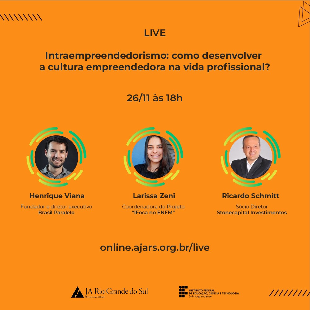 Nesta quinta-feira, dia 26, às 18h, ocorrerá a palestra “Intraempreendedorismo: como desenvolver a cultura empreendedora na vida profissional?”. A atividade contará com a participação da estudante do curso Técnico em Eventos, Larissa Zeni, coordenadora do projeto “Ifoca no Enem”. A palestra está sendo promovida pela parceira entre o Câmpus Sapucaia do Sul e a empresa Junior Achievement Rio Grande do Sul (JARS). A transmissão da live será feita através do link: https://online.ajars.org.br/live