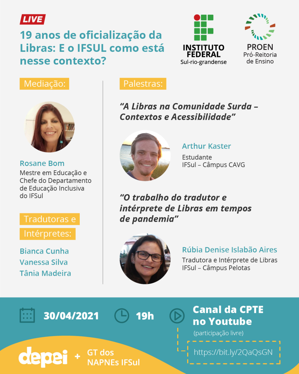 O primeiro evento ocorre nesta sexta-feira (23), às 19h, com palestras sobre o desafio de traduzir o vestibular do IFSul para Libras e também as possibilidades que a Libras oferece de conexão com a sociedade. Já no dia 30, também às 19h, as palestras abordarão contextos e acessibilidade da Libras na comunidade surda, além do trabalho do intérprete e tradutor em tempos de pandemia. As transmissões ao vivo poderão ser acompanhadas pelo canal da CPTE no Youtube.