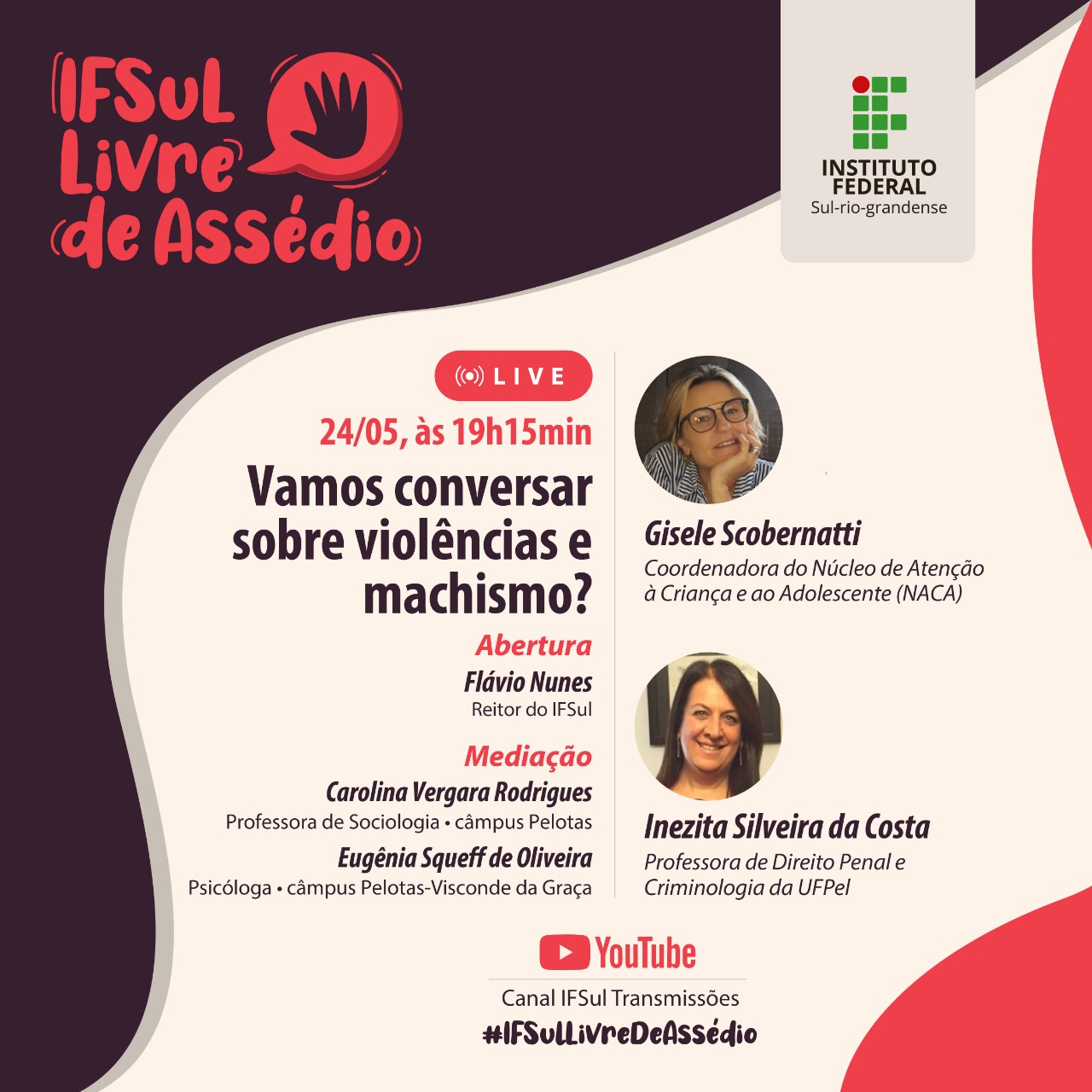 Um tema sério e muito importante será pauta de uma live promovida pelo IFSul nesta segunda-feira (24). Dentro da campanha “IFSul livre de assédio”, a atividade tem como principal objetivo propor uma conversa sobre violências e machismo.