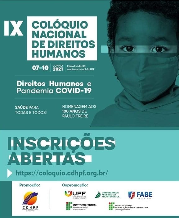 O câmpus Passo Fundo está participando da comissão organizadora do IX Colóquio Nacional de Direitos Humanos. O evento online acontece de 07 a 10 de junho na sala de videoconferências da Universidade de Passo Fundo (UPF). O tema será: Direitos Humanos e Pandemia Covid-19; Lema: Saúde para todos! O evento contará com espaço destinado para discussão de trabalhos/comunicações.
