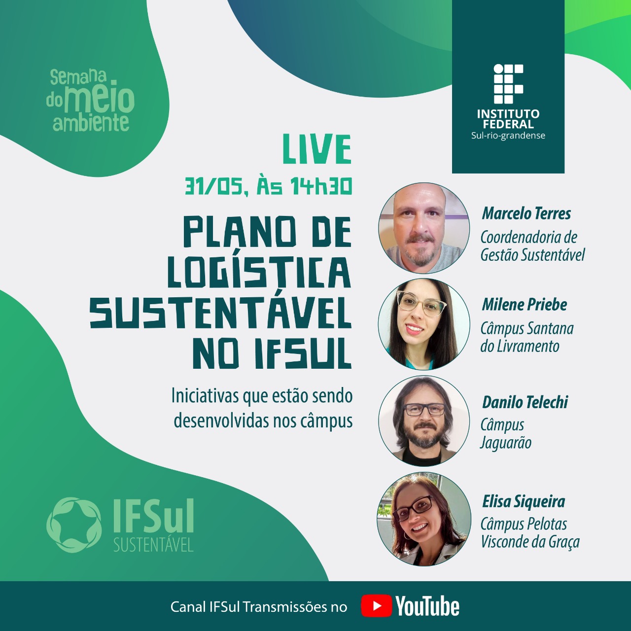 Começa, nesta segunda-feira (31/05), uma série de atividades alusivas à Semana do Meio Ambiente no IFSul. Durante a tarde, será realizada a live “Plano de Logística Sustentável no IFSul: iniciativas que estão sendo desenvolvidas nos câmpus”. A atividade, aberta a toda a comunidade, ocorre a partir das 14h30min e conta com transmissão ao vivo pelo canal IFSul Transmissões no Youtube.