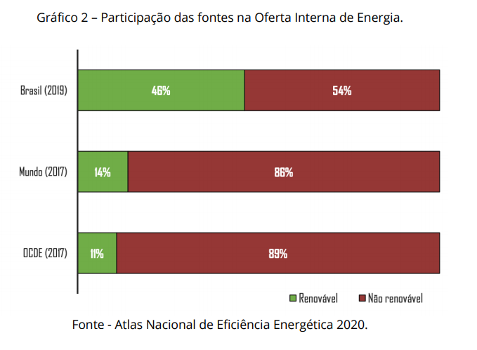 Já se considerarmos a geração de energia de forma geral - vale lembrar que a energia elétrica é apenas um dos tipos de energia -, a matriz renovável no país, segundo dados do Atlas Nacional de Eficiência Energética 2020, representa 46%, enquanto a matriz não renovável ocupa 54%. O professor Raul destaca que esses percentuais mudam bastante quando ampliamos a análise para uma perspectiva global: no mundo, apenas 14% da oferta de energia se refere a fontes renováveis, sendo 86% oriundas de fontes não renováveis.