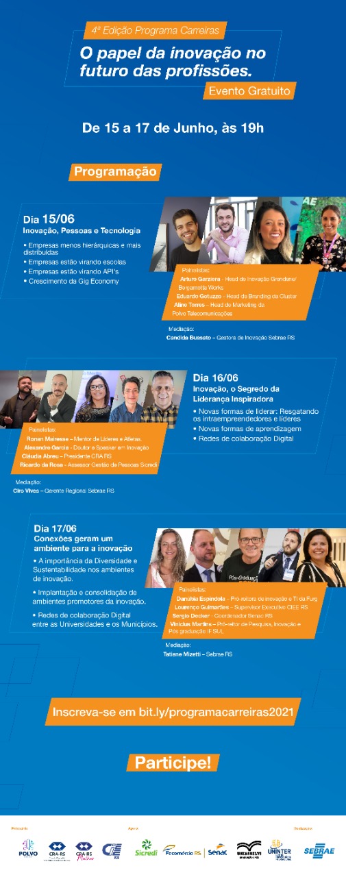 Na quarta (16), o tema será: Inovação, O Segredo da Liderança Inspiradora. O evento terá a mediação do gerente regional do Sebrae RS, Ciro Vives. No encerramento na quinta (17), o tema será: Conexões geram um ambiente para inovações e terá a mediação de Tatiane Mizeti, do Sebrae RS.