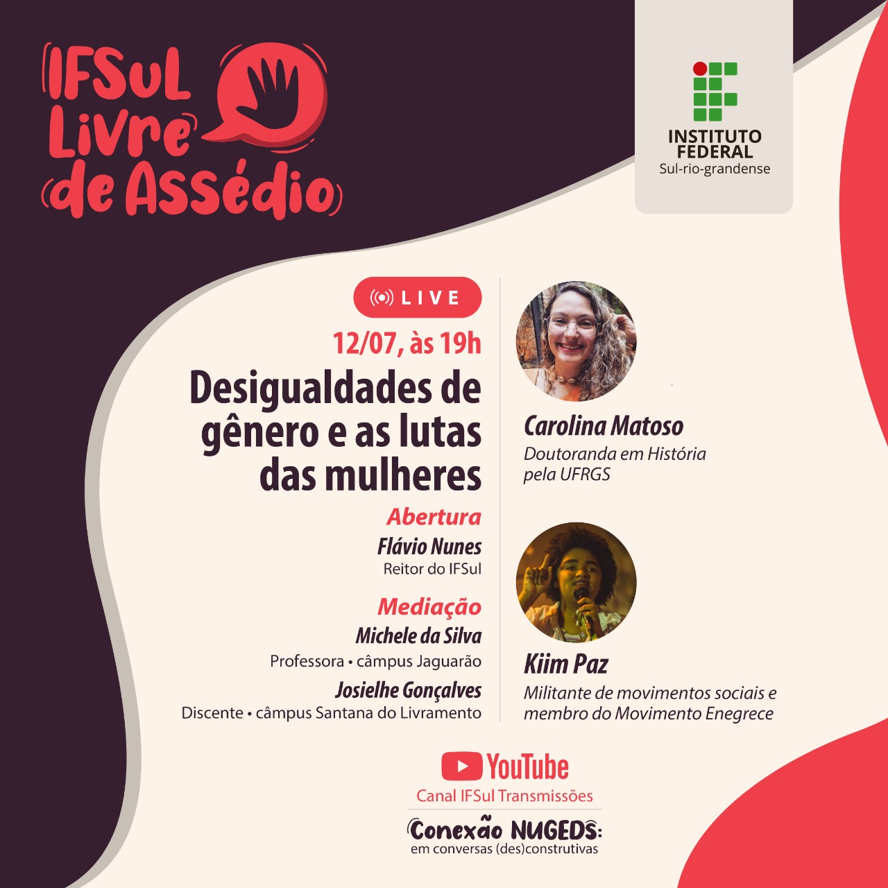 Na próxima segunda-feira (12), às 19h, ocorre mais uma live da campanha “IFSul livre de assédio”. O tema da conversa será “Desigualdades de gênero e as lutas das mulheres”. Aberto a toda a comunidade, o evento contará com transmissão ao vivo pelo canal IFSul Transmissões, no Youtube.
