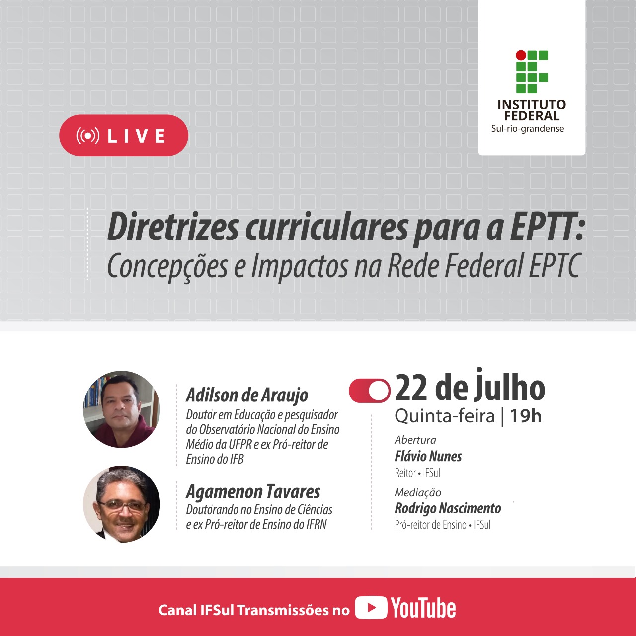 A Pró-reitoria de Ensino do IFSul (Proen) promove nesta quinta-feira (22), a partir das 19h, a live Diretrizes curriculares para a EPTT: concepções e impactos da Rede Federal EPTC. O evento virtual, aberto a toda a comunidade, contará com a participação de convidados que irão estabelecer um diálogo acerca das políticas educacionais em EPTT. A transmissão acontece pelo canal IFSul Transmissões no Youtube e será fornecido certificado de participação.