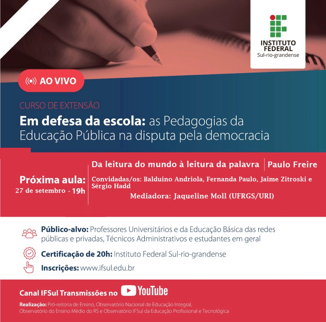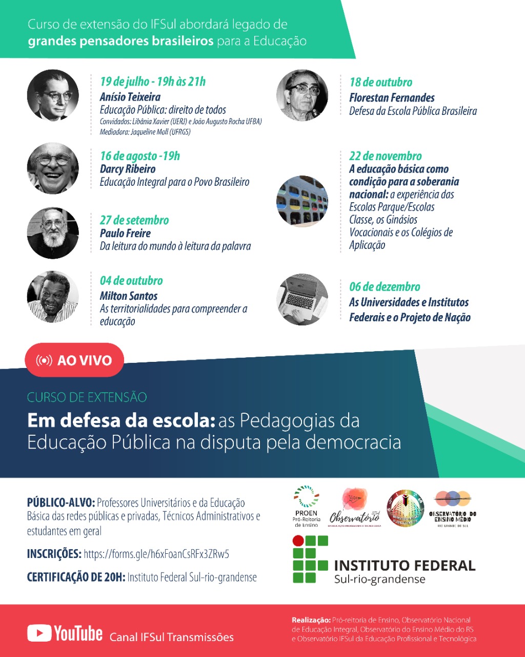 Em alusão ao centenário de Paulo Freire, serão discutidas as contribuições desse grande pensador para educação brasileira, através da Pró-reitoria de Ensino, Observatório Nacional de Educação Integral, pelo Observatório do Ensino Médio do RS e pelo observatório IFSul da Educação Profissional e Tecnológica.
