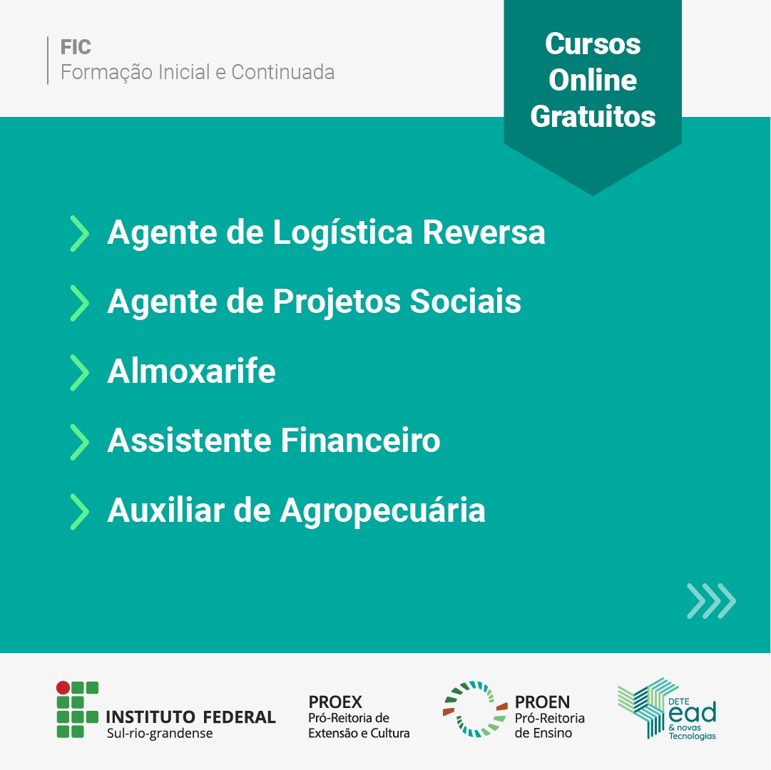 Estão abertas as inscrições para 20 mil novas vagas em dez cursos gratuitos de Formação Inicial e Continuada (FIC) ofertados pelo IFSul. Todos os cursos disponibilizados são na modalidade a distância. As inscrições poderão ser feitas até o dia 12 de outubro ou até o preenchimento das vagas.