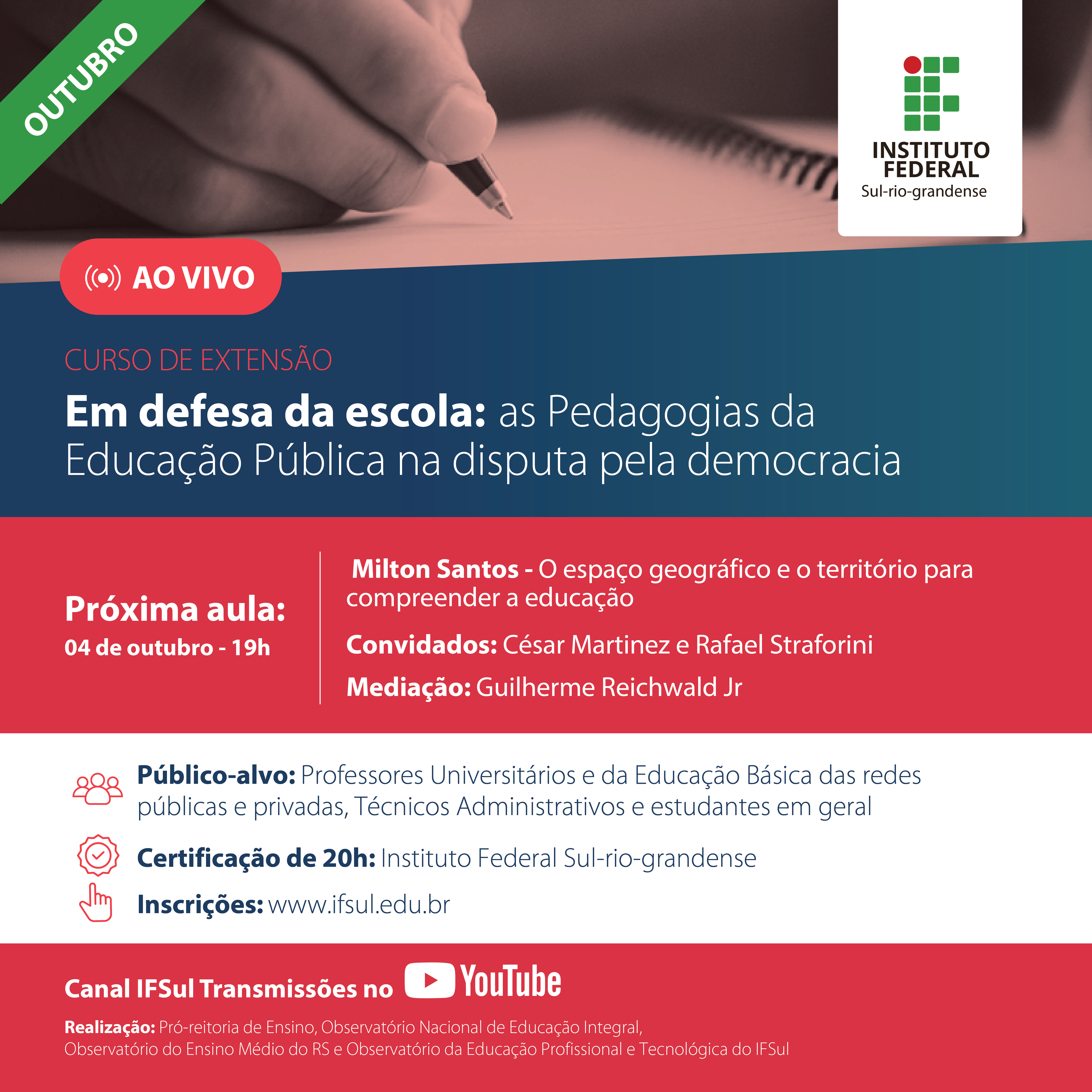 Ocorre, nesta segunda-feira (4), às 19h, mais uma aula virtual do curso de extensão “Em defesa da escola: as pedagogias da educação pública na disputa pela democracia”, promovido pelo IFSul. No encontro de hoje, serão abordadas as contribuições de Milton Santos para a área. O tema do encontro será “O espaço geográfico e o território para compreender a educação” e terá como convidados César Martinez e Rafael Straforini, com mediação de Guilherme Reichwald Jr.