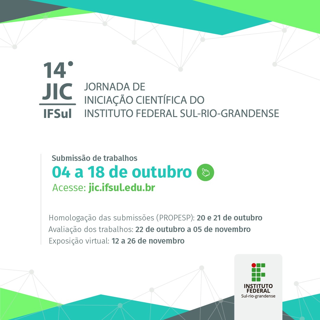 Estão abertas as inscrições para a 14ª Jornada de Iniciação Científica do IFSul, a JIC. A submissão de trabalhos para o evento poderá ser realizada até o dia 18 de outubro.