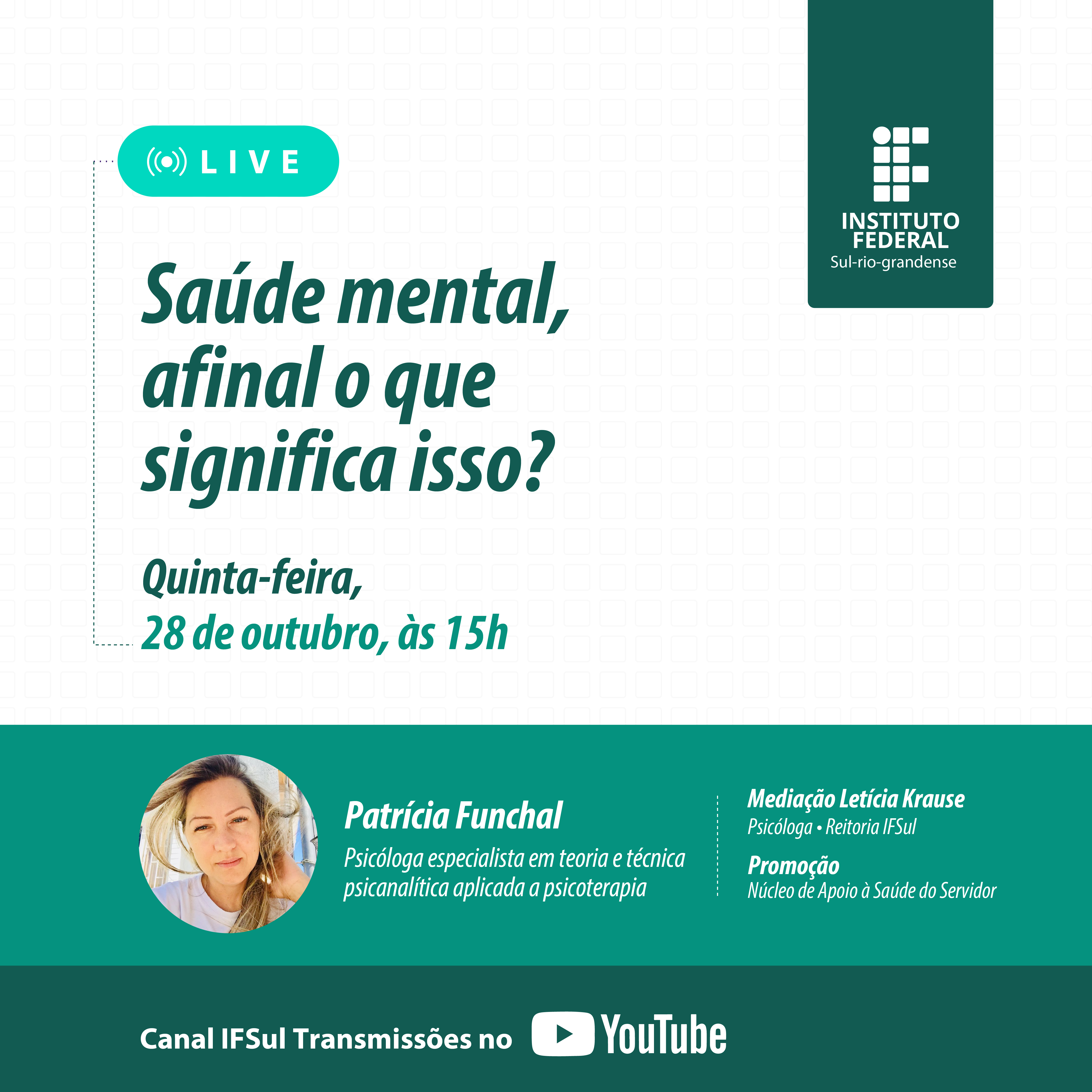 O IFSul vai realizar, nesta quinta-feira (28), às 15h, uma live com o tema “Saúde mental, afinal o que significa isso?”. Promovido pelo Núcleo de Apoio à Saúde do Servidor (Nass), o evento será aberto ao público e terá transmissão ao vivo pelo canal IFSul Transmissões, no Youtube.