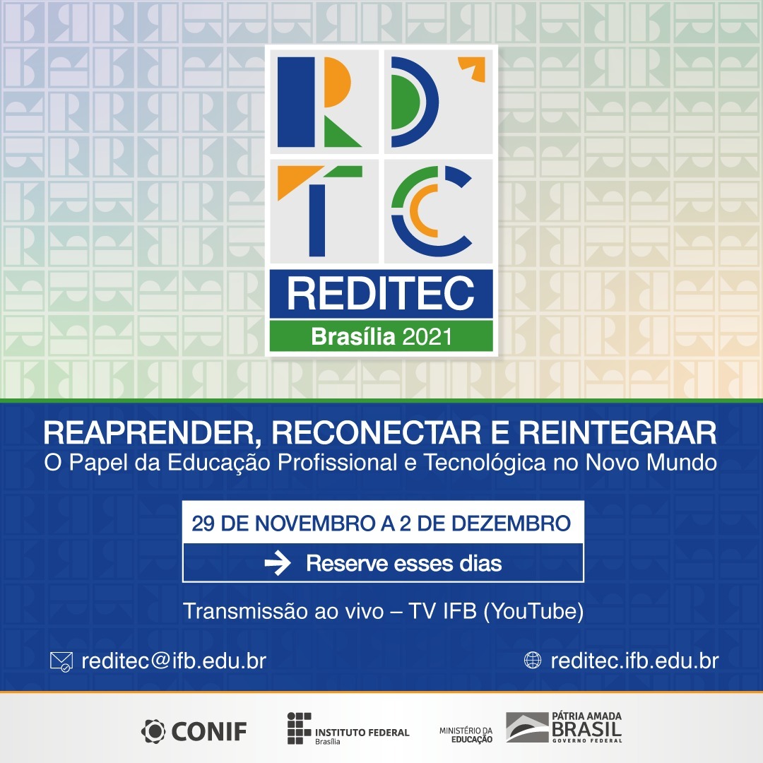 A 45ª edição da Reunião de Dirigentes das Instituições Federais de Educação Profissional e Tecnológica (Reditec) ocorrerá entre os dias 29 de novembro e 2 de dezembro, tendo o Instituto Federal de Brasília como organizador. Neste ano, o tema do evento será “Reaprender, reconectar e reintegrar: o papel da educação profissional e tecnológica no novo mundo”.