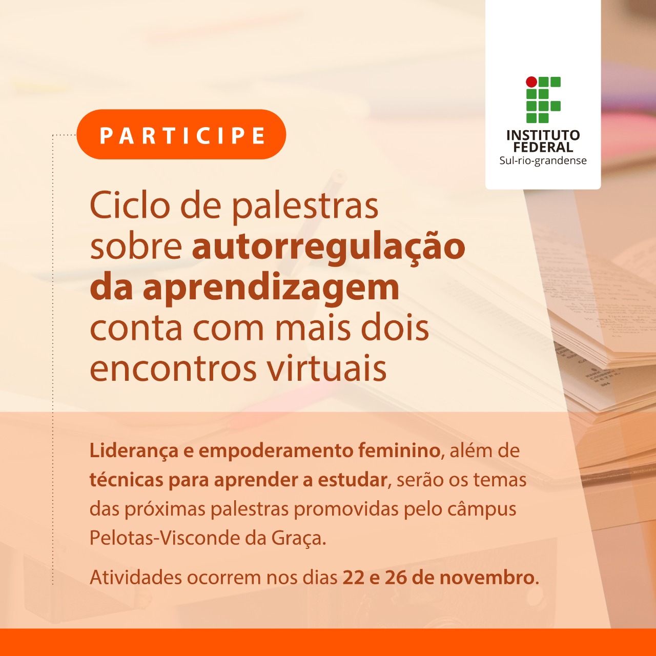 Liderança e empoderamento feminino, além de técnicas para aprender a estudar, serão os temas das próximas palestras promovidas pelo câmpus Pelotas-Visconde da Graça. Atividades ocorrem nos dias 22 e 26 de novembro