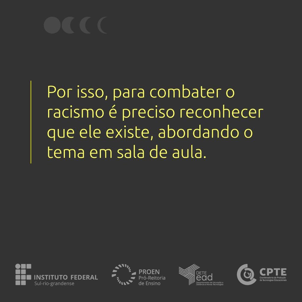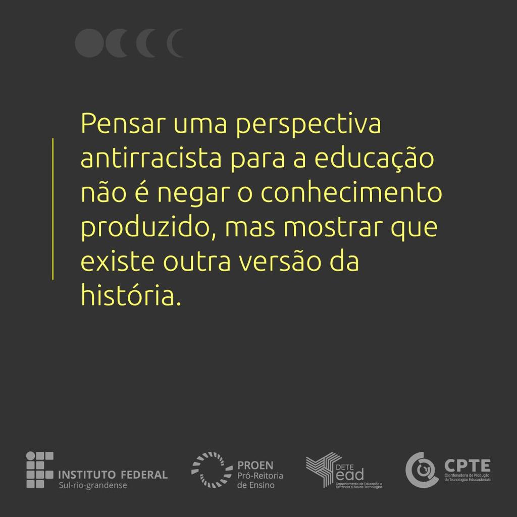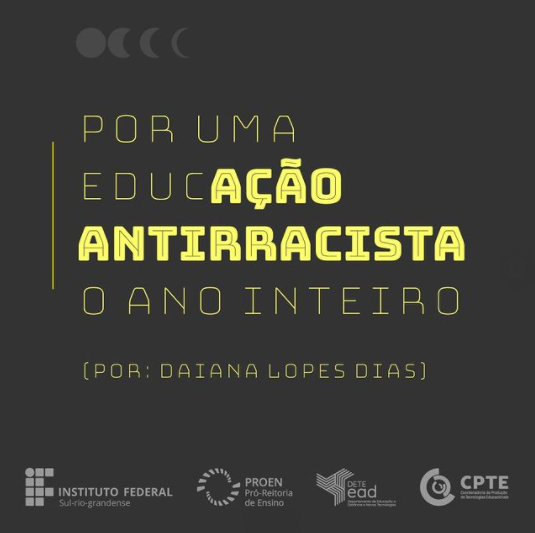 Com o tema “Educação antirracista”, uma publicação da Proen alusiva ao mês da Consciência Negra chama a atenção para a necessidade de torná-la uma prática ao longo de todo o ano. O convite à reflexão é feito a partir de uma série de chamadas textuais baseadas na contribuição teórica da servidora Daiana Lopes Dias, do câmpus Pelotas-Visconde da Graça, que é licenciada em História pela Furg, especialista em História do Rio Grande do Sul e mestra e doutoranda em Ciência Política pela UFPel.