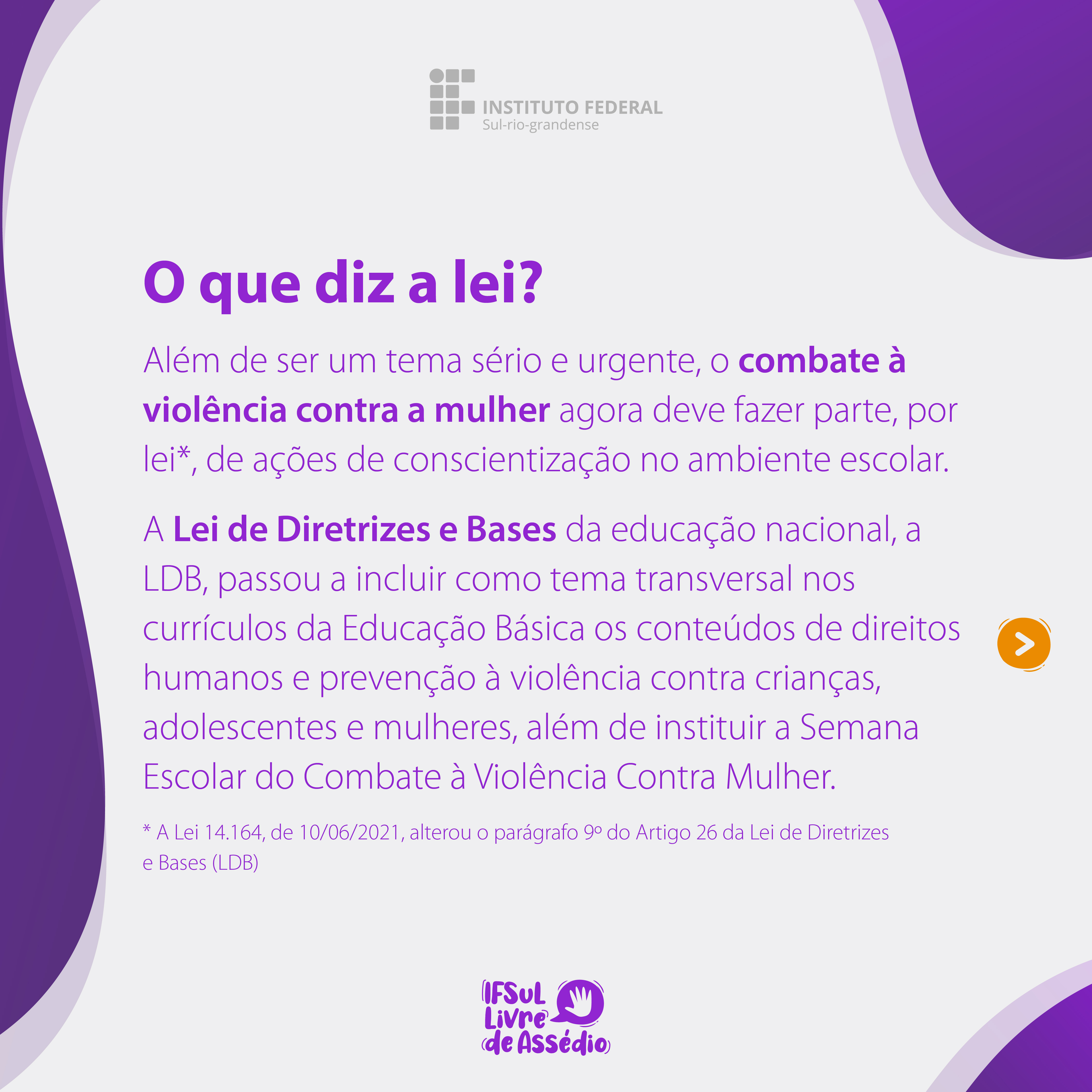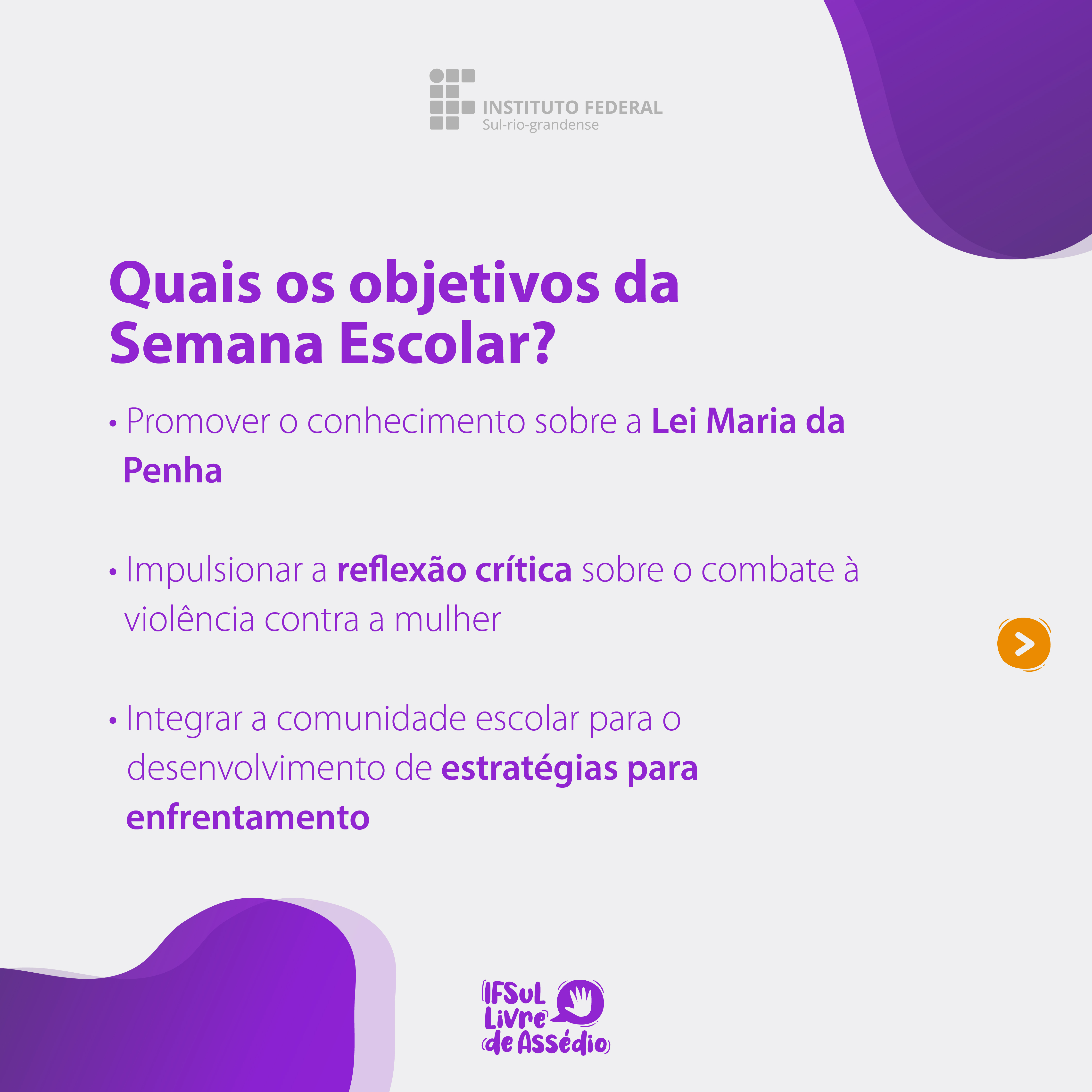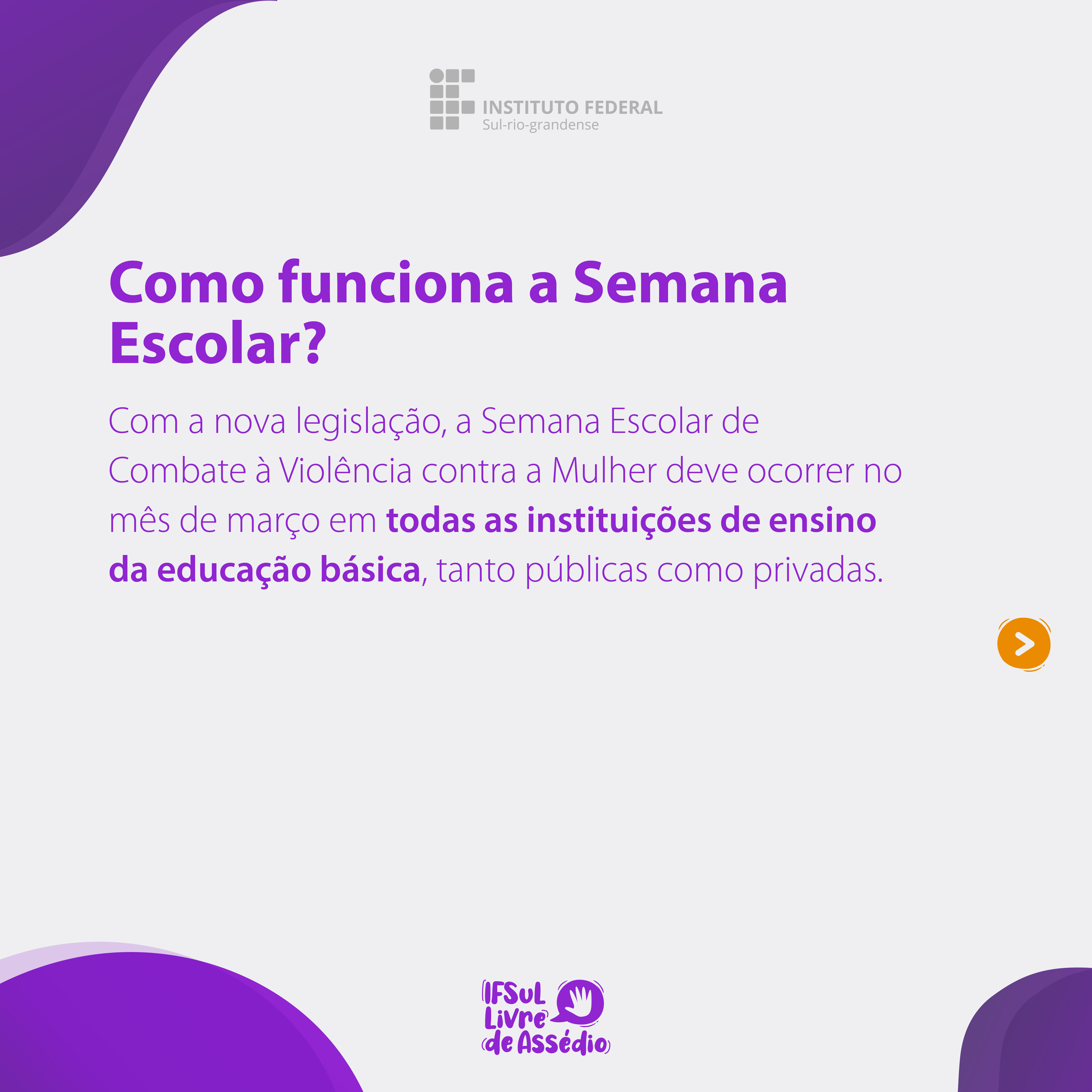Com a nova legislação, a Semana Escolar de Combate à Violência contra a Mulher deve ocorrer no mês de março em todas as instituições de ensino da educação básica, tanto públicas como privadas, buscando orientar a comunidade para este importante tema.