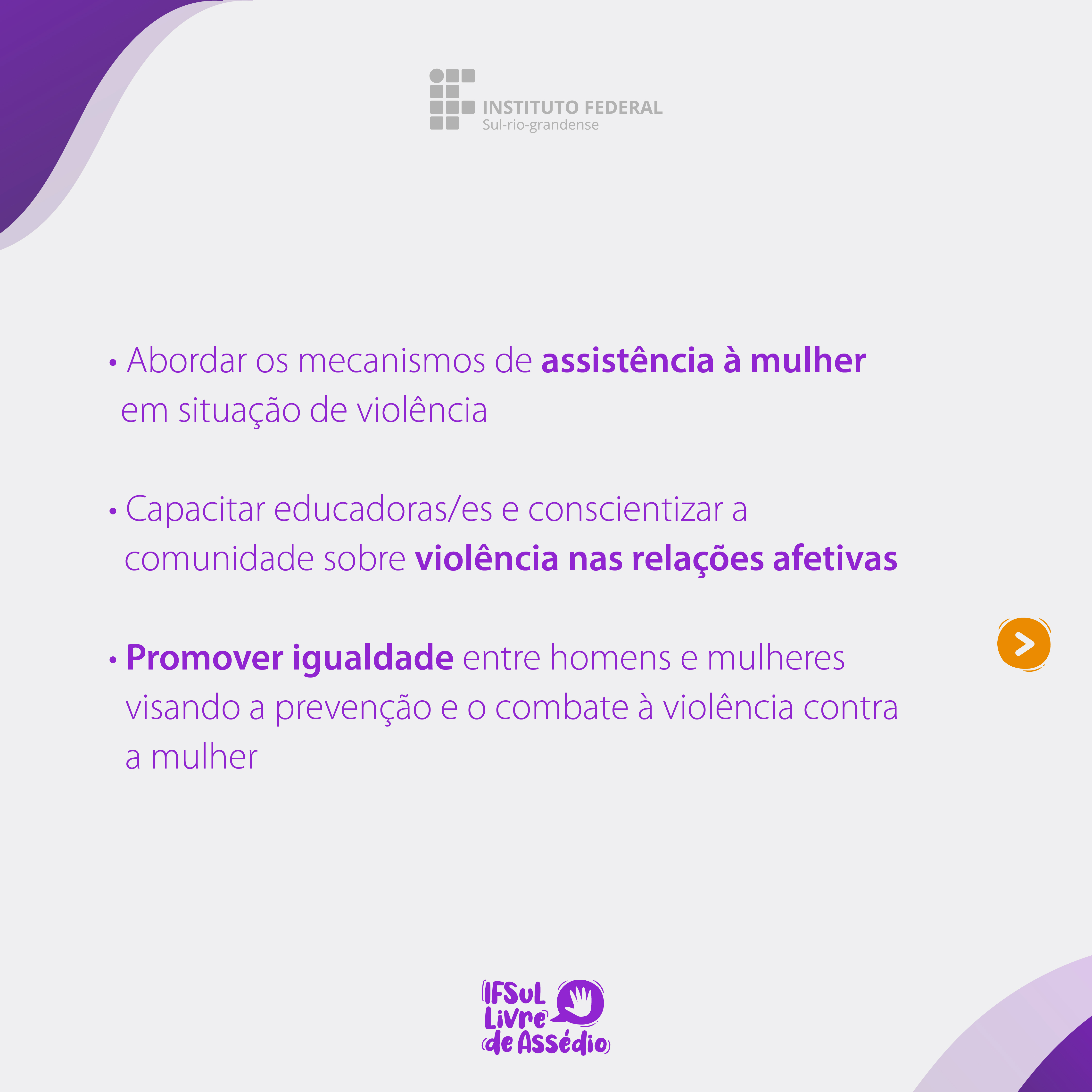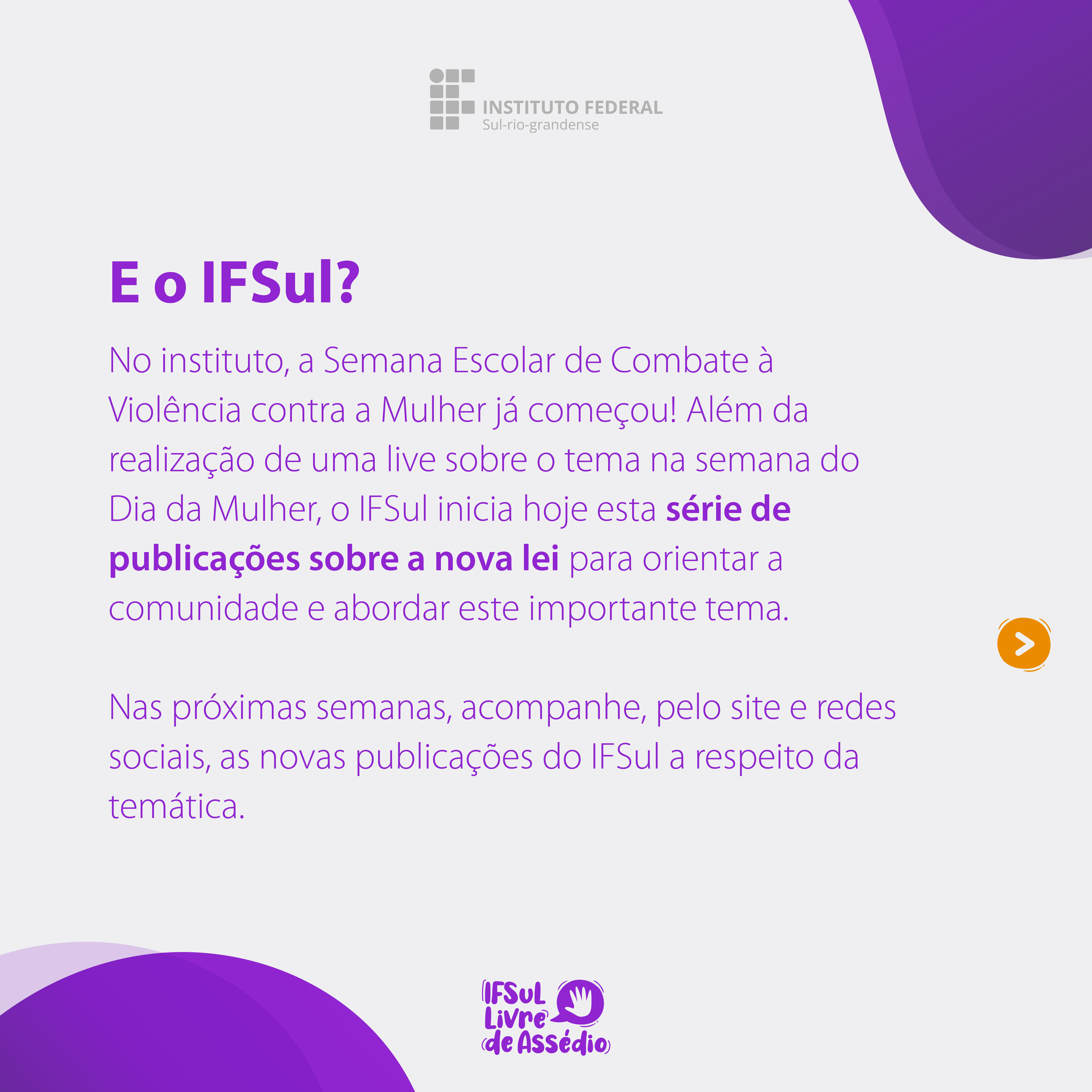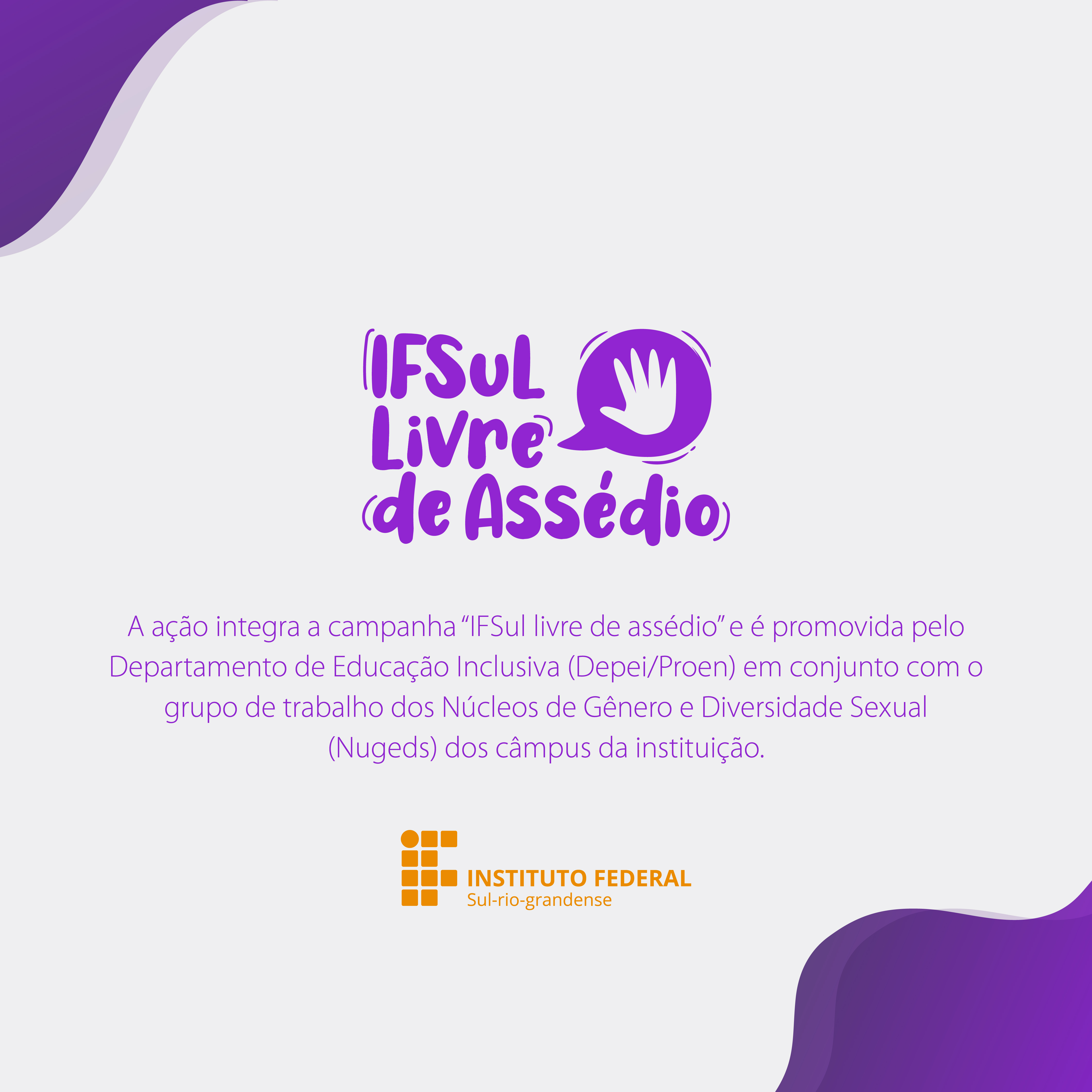 O IFSul lançou nesta quinta-feira (17) uma série de publicações de orientação e conscientização nas redes sociais. A iniciativa integra a campanha “IFSul livre de assédio” e faz parte das ações do instituto dentro da Semana Escolar de Combate à Violência contra a Mulher. Serão três publicações até o final do mês de março.