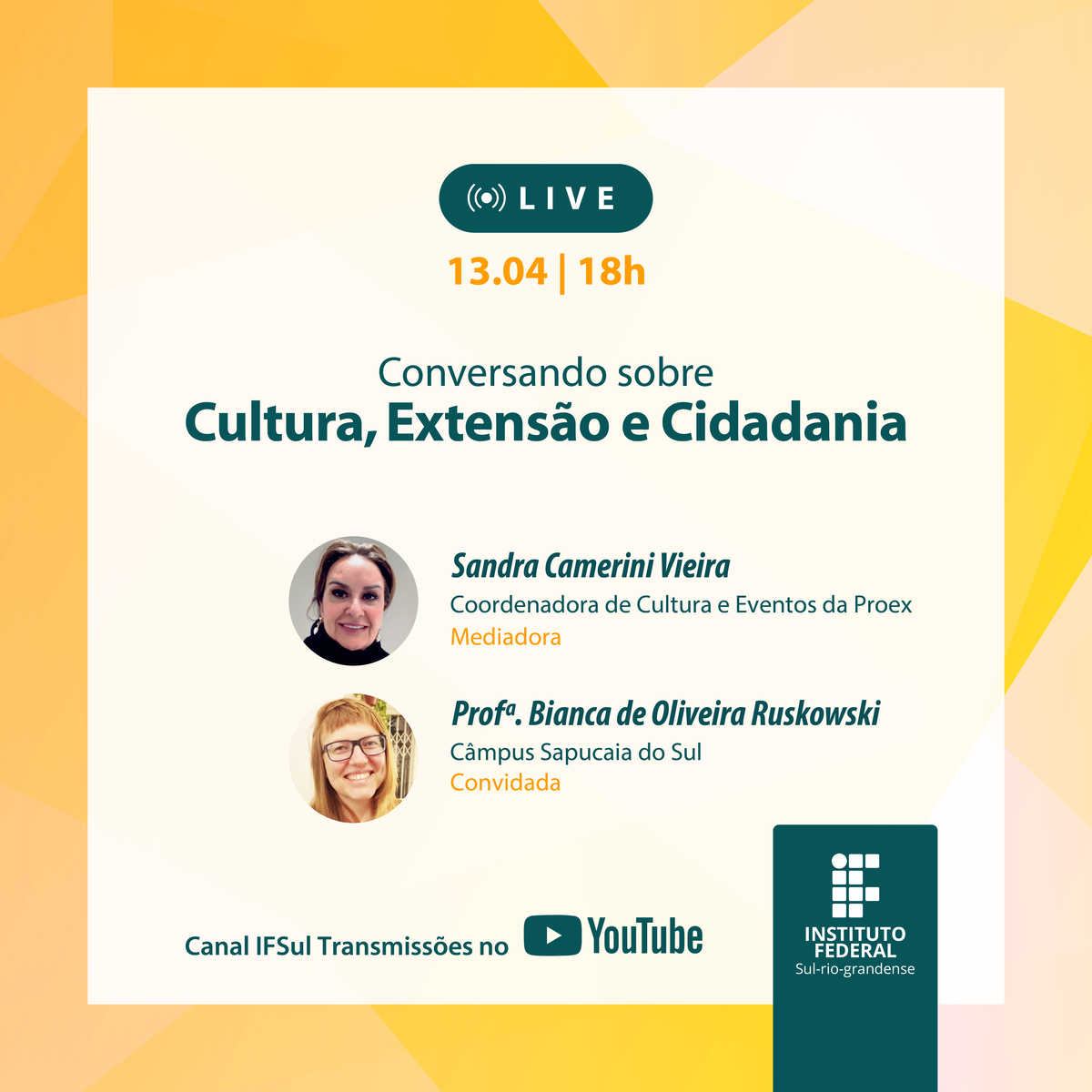 A live terá como mediadora, a Coordenadora de Cultura e Eventos da Proex, Sandra Camerini Vieira, e, como convidada, a professora do câmpus Sapucaia do Sul, Bianca de Oliveira Ruskowski.