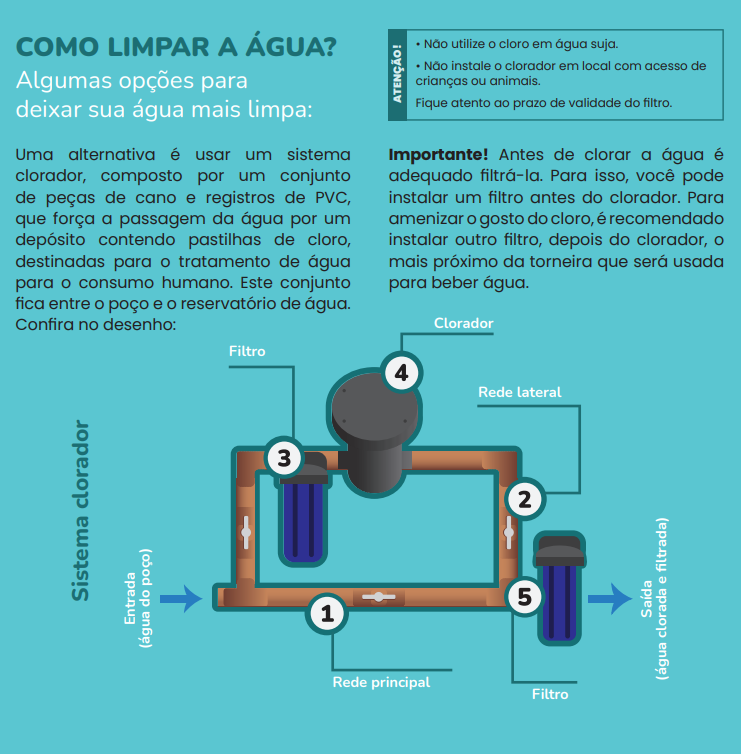 Além do viés educativo, no material é apresentado um mecanismo simples e de baixo custo para a cloração e filtração da água.