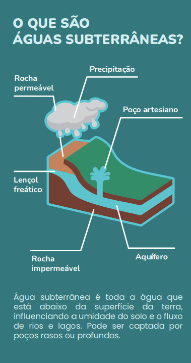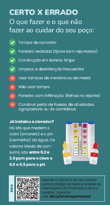 Também são elencadas as possíveis causas de contaminação da água de um poço, tais como descarte incorreto de lixo e resíduos industriais; uso de agrotóxicos ou fertilizantes e vazamento de fossas ou redes de esgoto.