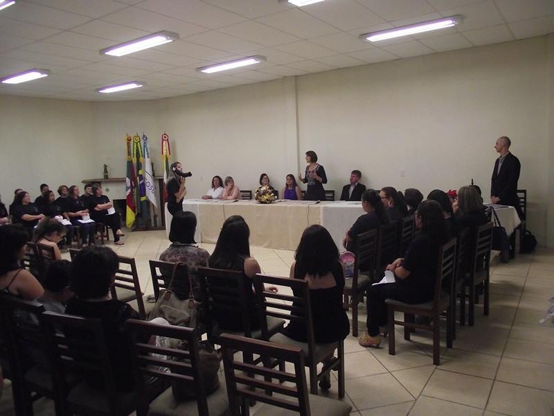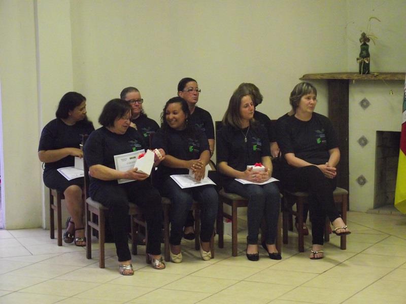 A cerimônia de entrega dos certificados das 18 alunas que concluíram o curso foi realizada no Sindicato Rural de Cristal. Os componentes da mesa foram agraciados com uma cesta contendo compotas de doces e conservas produzidos pelas alunas durante a realização do curso.