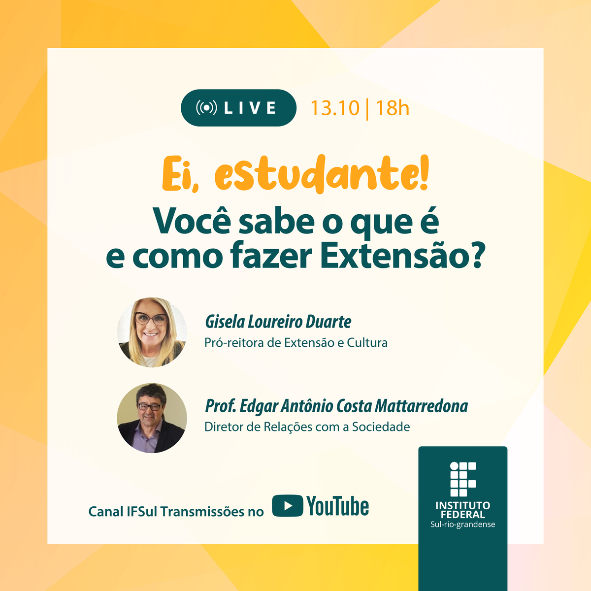 A Pró-reitoria de Extensão e Cultura do IFSul, convida toda a comunidade estudantil a participar da live “Ei Estudante! Você sabe o que é e como fazer Extensão? “ O evento online ocorrerá no dia 13 de outubro, às 18h e será transmitido pelo canal IFSul transmissões, no youtube. Estarão participando da live, a pró-reitora de Extensão e Cultura, Gisela Duarte e o diretor de Relações com a Sociedade, Edgar Matarredona.
