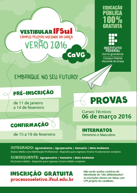 O Vestibular de Verão 2016 do câmpus Pelotas-Visconde da Graça (CaVG) está com pré-inscrições abertas a partir desta segunda-feira (11). Até o dia 14 de fevereiro, os estudantes podem realizar a sua pré-inscrição pelo site do Processo Seletivo, onde também está disponível o edital completo da seleção.