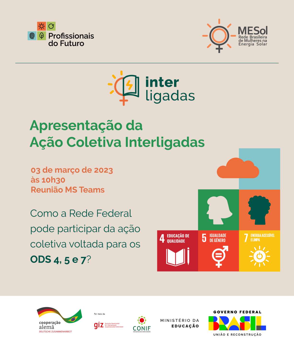 “No webinar, representantes da GIZ compartilharão informações detalhadas acerca da iniciativa e destacarão de que maneira a Rede Federal pode participar da Ação”, destaca a assessora de Relações Internacionais do Conselho, Ana Carolina Oliveira. A ação está alinhada ao eixo estratégico de internacionalização do Conif, que diz respeito à implementação da Agenda de Desenvolvimento Sustentável 2030, notadamente os objetivos referentes à qualidade da educação e equidade de gênero.
