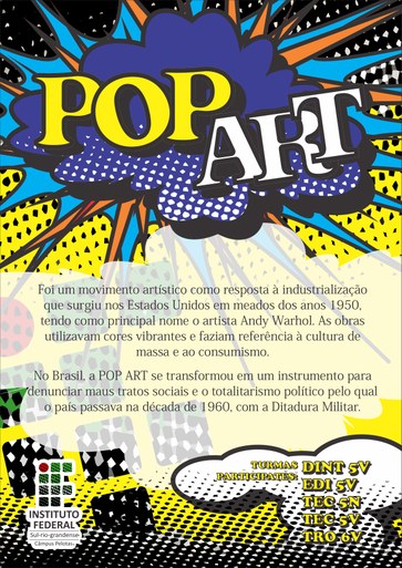 Tendo a Pop Art como referência os alunos da turma 5V do curso de Design de Interiores, 5V de Edificações, 5N e 5V de Eletrotécnica e 6V de Eletrônica, produziram trabalhos realizando uma crítica ao momento atual, tendo como foco as mídias digitais, questões sociais e políticas.