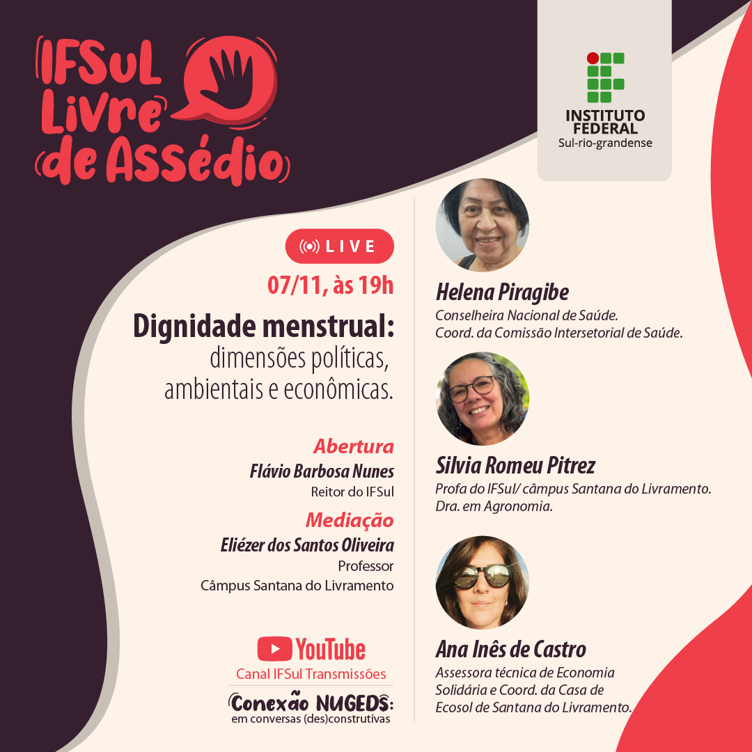 No dia 6 de novembro, às 19h, acontece a live intitulada “ Projeto Dignidade menstrual do IFSul: Relatos do câmpus Santana do Livramento. No dia 7, às 19h, será realizada a live intitulada “ Dignidade menstrual: Dimensões políticas, ambientais e econômicas. Já no dia 9, também às 19h, acontece a live denominada “A educação em sexualidade e a equidade na saúde”. A abertura de todas as lives será realizada pelo reitor do IFSul, Flávio Nunes.