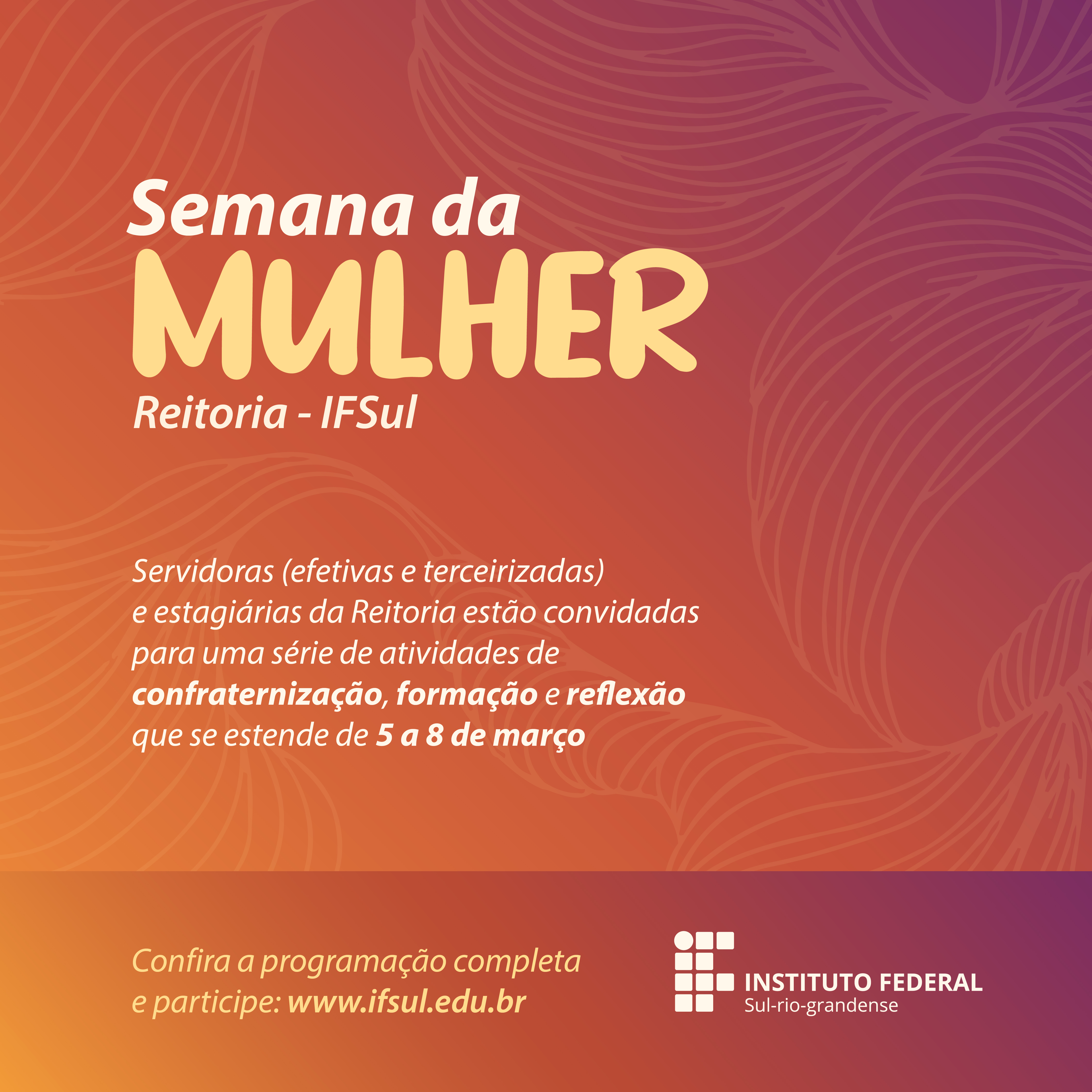 A reitoria do IFSul preparou uma programação especial para celebrar a semana dedicada à luta das mulheres. A partir da próxima terça-feira (5) até a sexta, dia internacional das mulheres, serão realizadas confraternizações, cursos e palestras destinados principalmente às servidoras (efetivas e terceirizadas) e estagiárias da unidade.
