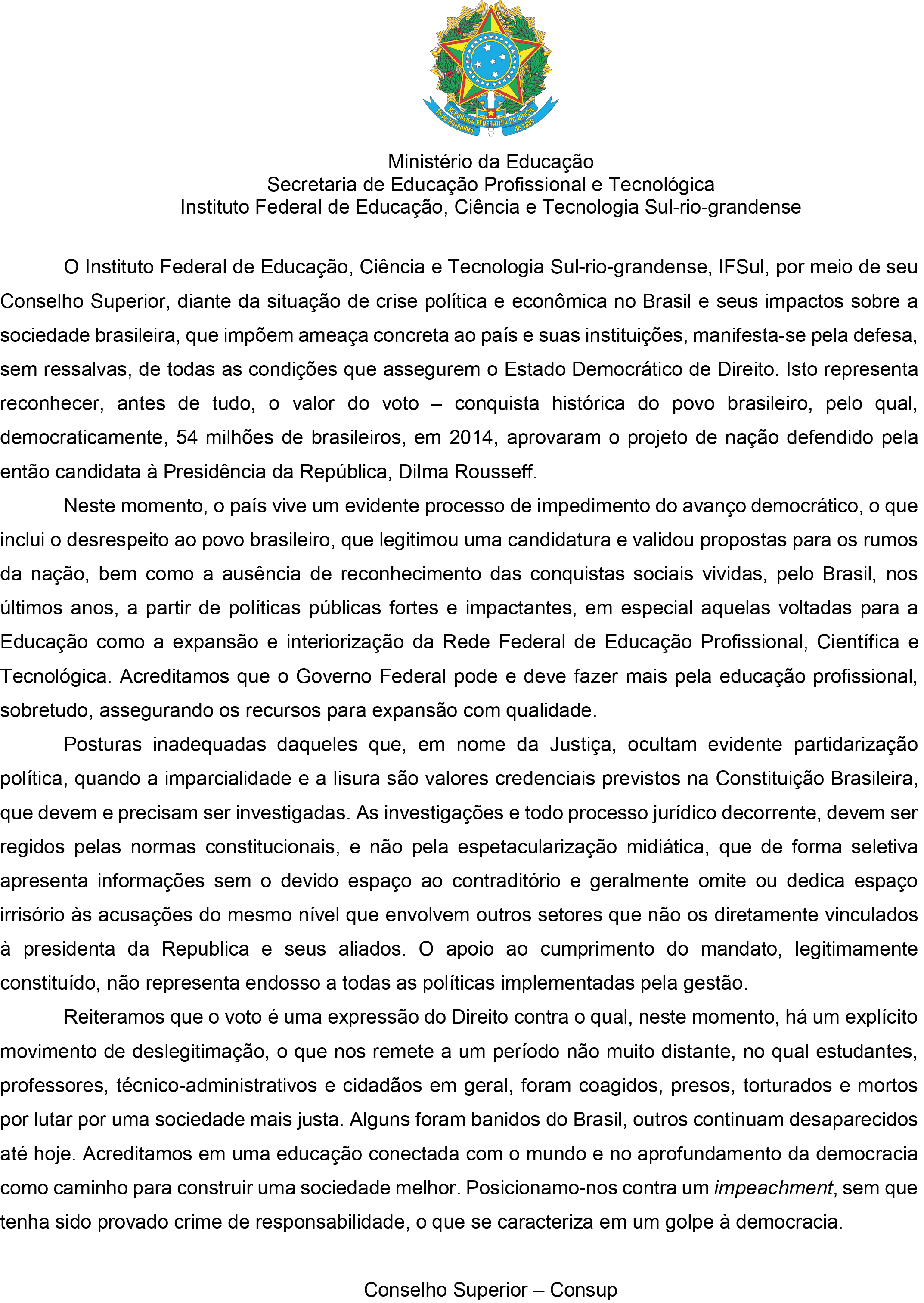 O Conselho Superior, reunido no dia 29/03/2016 aprovou o seguinte manifesto