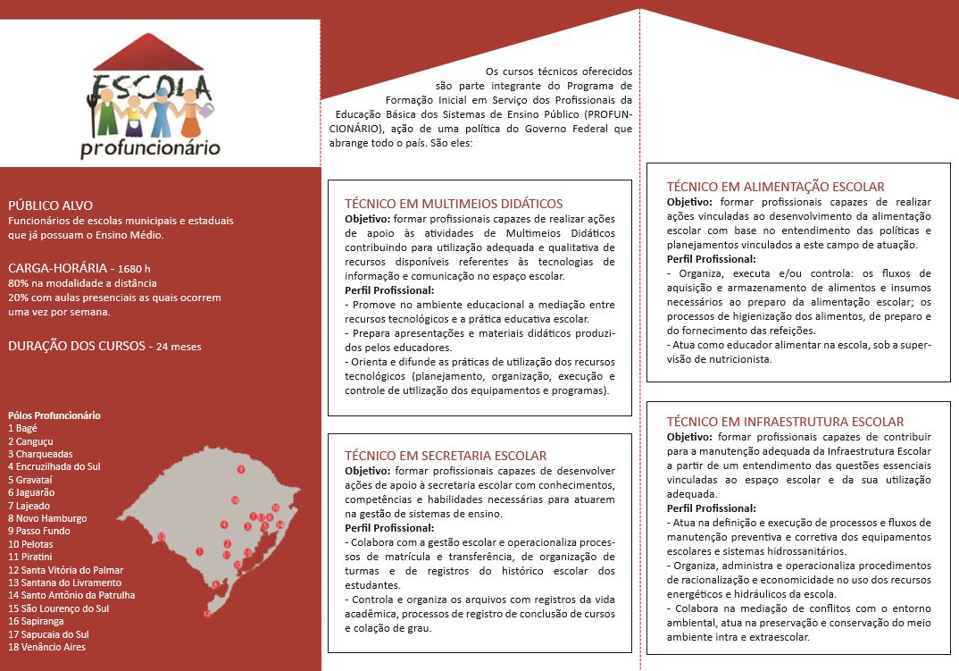 No IFSul, são oferecidos quatro cursos técnicos: em alimentação escolar, infraestrutura escolar, multimeios didáticos e secretariado escolar.
