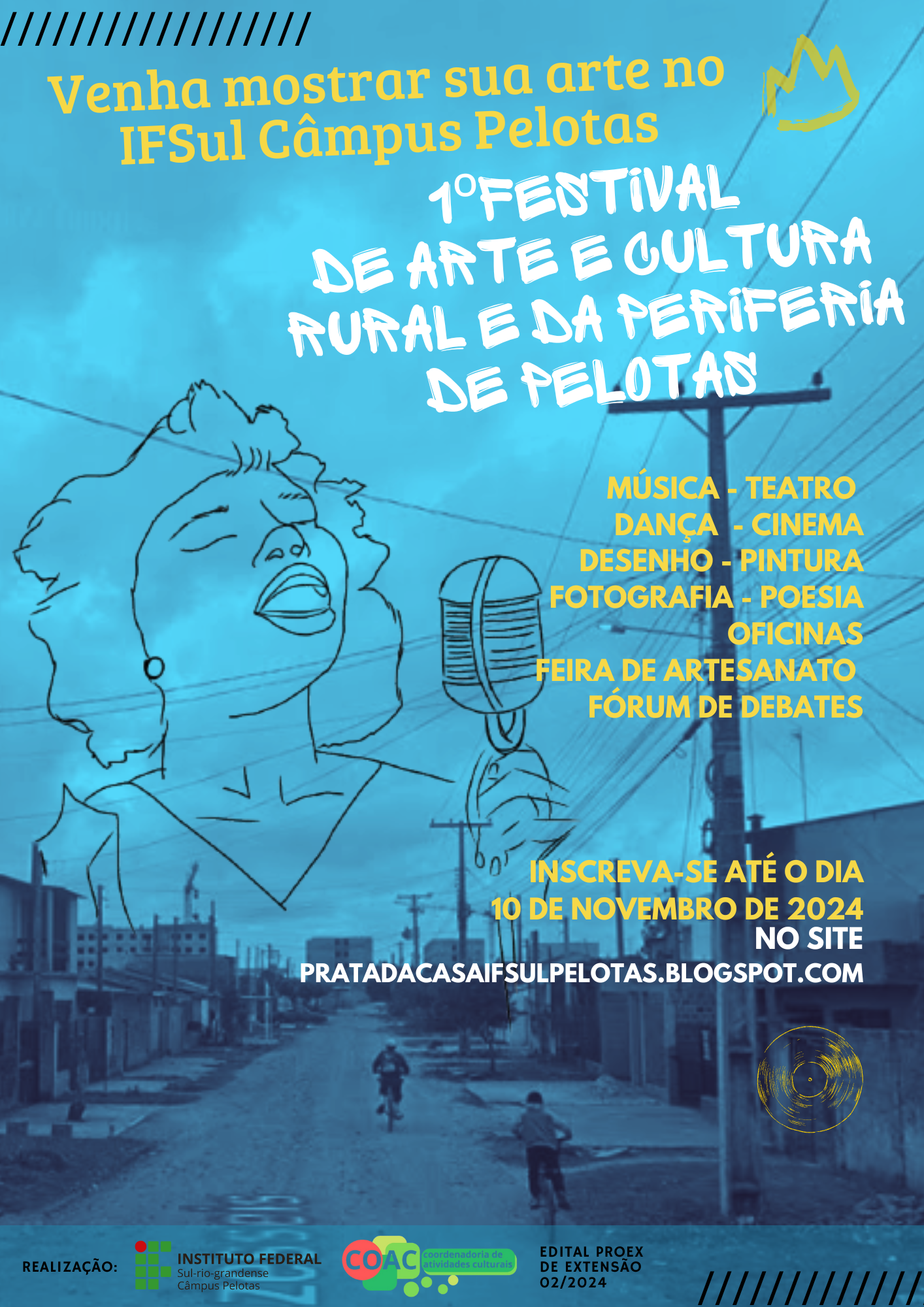 A Coordenadoria de Atividades Culturais - COAC, do Câmpus Pelotas, convida a comunidade pelotense para o 1º Festival de Arte e Cultura Rural e da Periferia de Pelotas, um evento de extensão cujo objetivo é difundir, valorizar e reconhecer a produção artística e cultural dos bairros distantes do centro da cidade, abrindo espaço para apresentações de música, teatro, dança, cinema, exposição de desenhos, pintura, fotografia, poesias e feira de artesanato.
