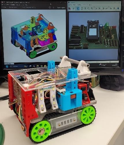 No que diz respeito à percepção do ambiente, o robô conta com um conjunto de sensores sofisticados. “Adotamos acelerômetro e giroscópio para controle de orientação, além de sensores infravermelhos de distância e sensor de cor para detecção de objetos e navegação”, detalha Marcelo. Um dos maiores desafios está na etapa de visão computacional: para isso, foram utilizadas duas câmeras OpenMV H7 Plus, importadas dos Estados Unidos. “Cada câmera teve um custo aproximado de R\$ 1.000,00 - valor que conseguimos viabilizar graças a doações de empresas parceiras do projeto”, complementa.