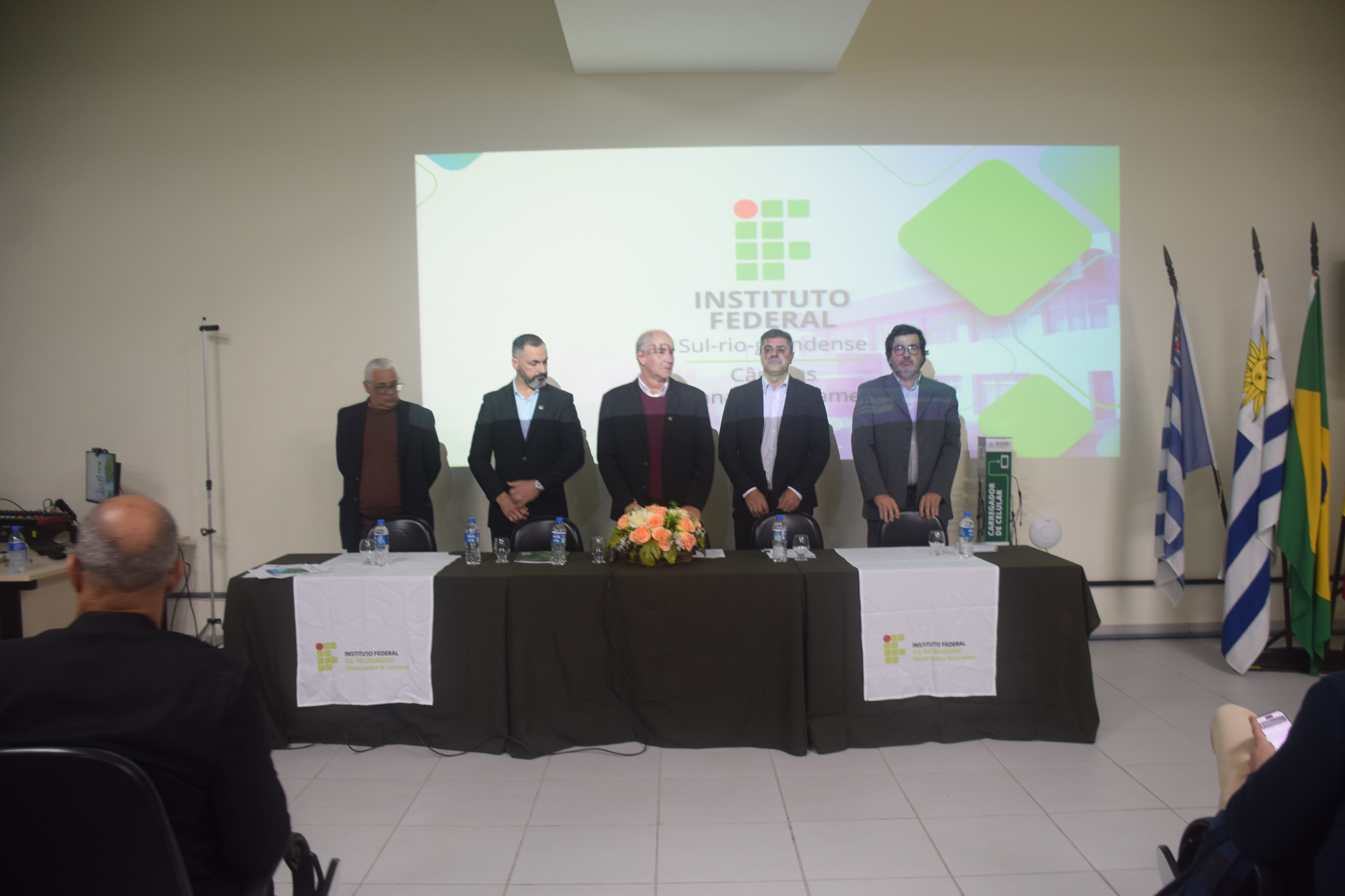 Participaram da mesa de autoridades, além do reitor e do ex-diretor, Celso Gonçalves, representantes da Universidade do Trabalho do Uruguai (UTU) e da Universidade Tecnológica do Uruguai (UTEC). A relação entre o IFSul e as instituições uruguaias é central na condução do câmpus, que tem uma história construída juntamente com os cursos binacionais.