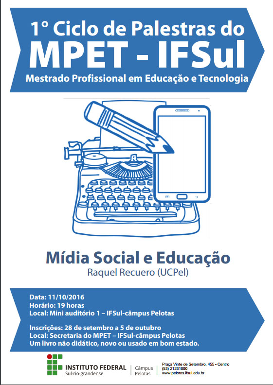 Os alunos do Mestrado Profissional em Educação e Tecnologia (MPET) do IFSul promovem o 1º ciclo de palestras. Na programação, no dia 11 de outubro, a partir das 19h, no Miniauditório 1 do câmpus pelotas, a professora da Universidade Católica de Pelotas, Raquel Recuero, abordará o tema “Midia Social e Educação”. As inscrições podem ser feitas até esta quarta (05) na secretaria do MPET.