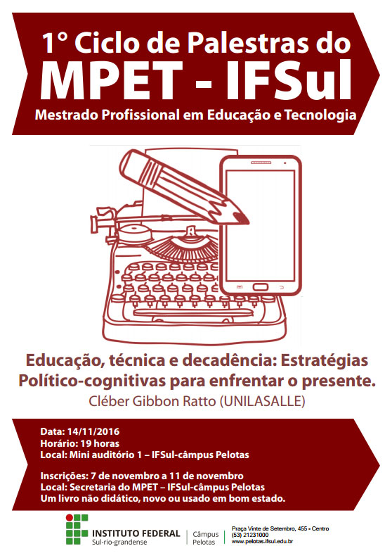 No dia 14 de novembro, o professor da Unilassale de Canoas (RS), Cléber Gibbon Ratto, a partir das 19h, no Mini-auditório 1 do câmpus pelotas, profere a palestra intitulada “Educação técnica e decadência: Estratégias Politíco-cognitivas para enfrentar o presente”. As inscrições podem ser feitas de 07 a 11 de novembro, na secretaria do MPET. Os organizadores informam que a doação de um livro não didático, que esteja novo ou usado em bom estado, é opcional.