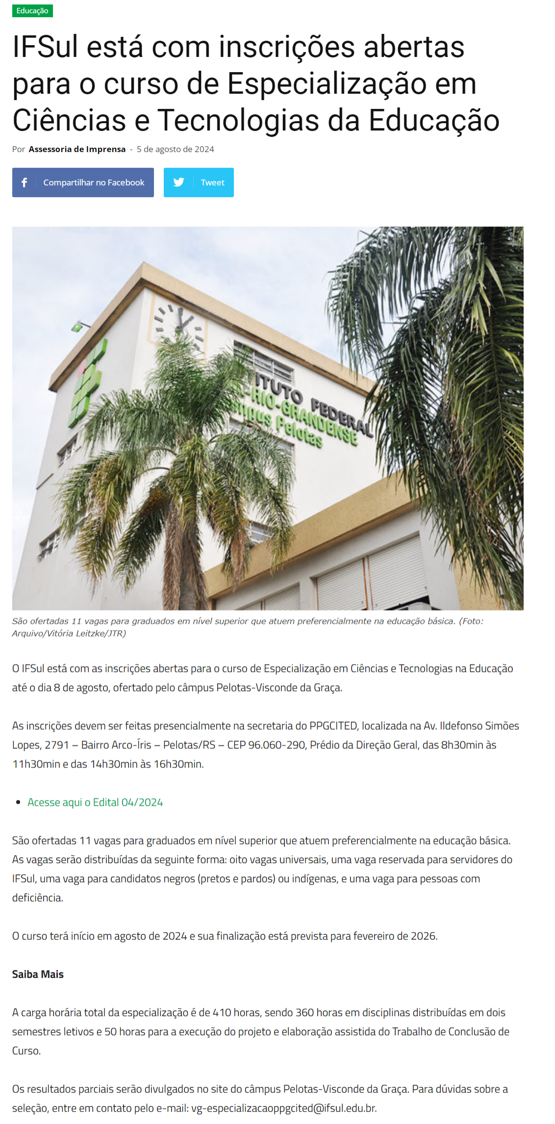 Jornal Tradição Regional - IFSul está com inscrições abertas para o curso de Especialização em Ciências e Tecnologias da Educação