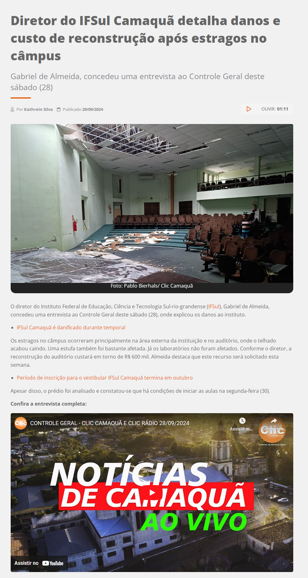 Clic Camaquã - Diretor do IFSul Camaquã detalha danos e custo de reconstrução após estragos no câmpus