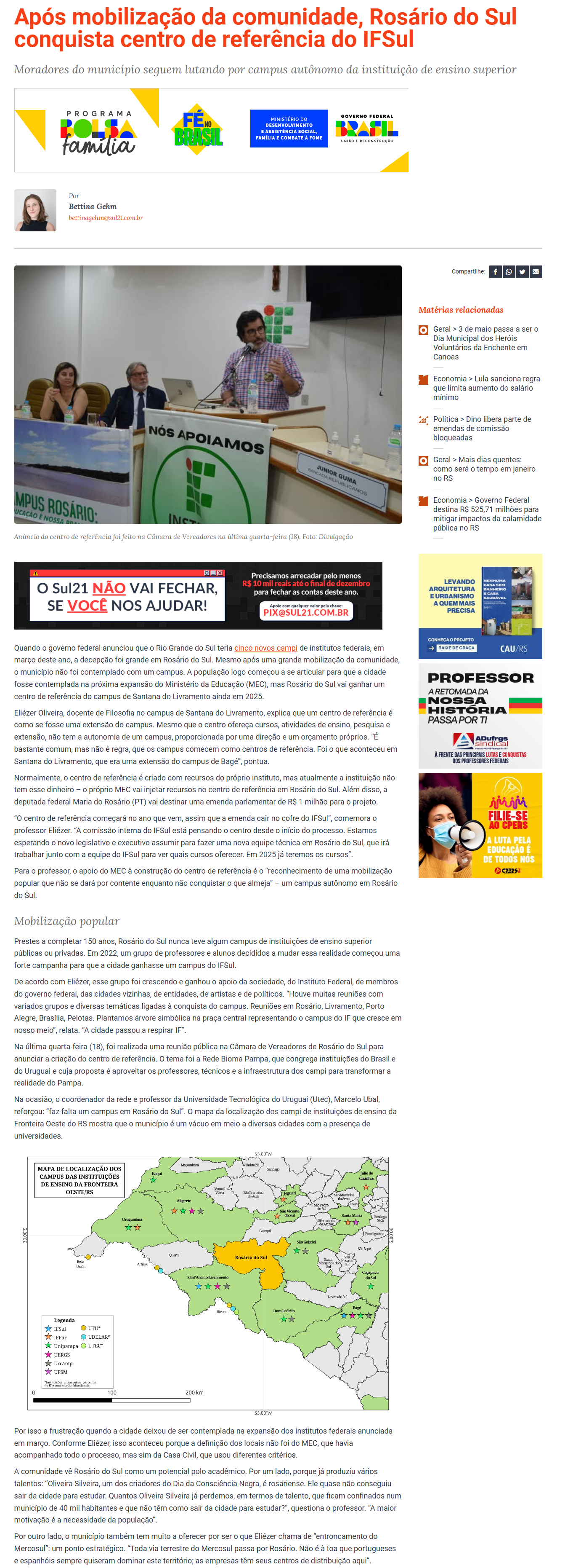 Sul 21 - Após mobilização da comunidade, Rosário do Sul conquista centro de referência do IFSul